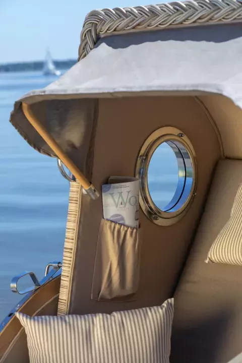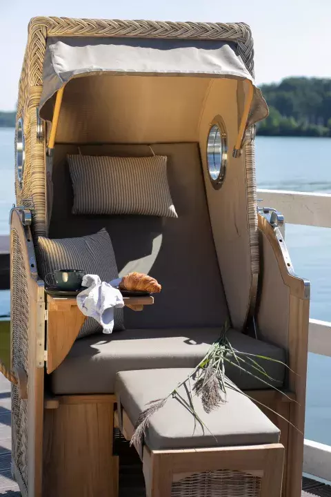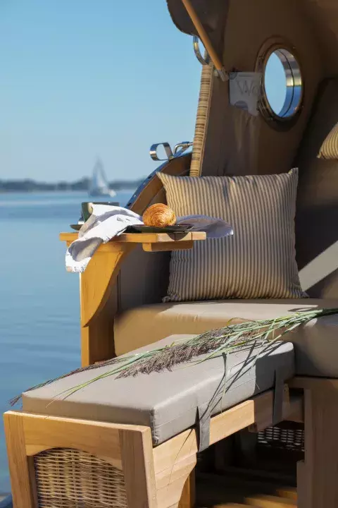 Praktische Extras: Ablageflächen, Getränkehalterungen und mehr im Einsitzer Strandkorb für den Balkon