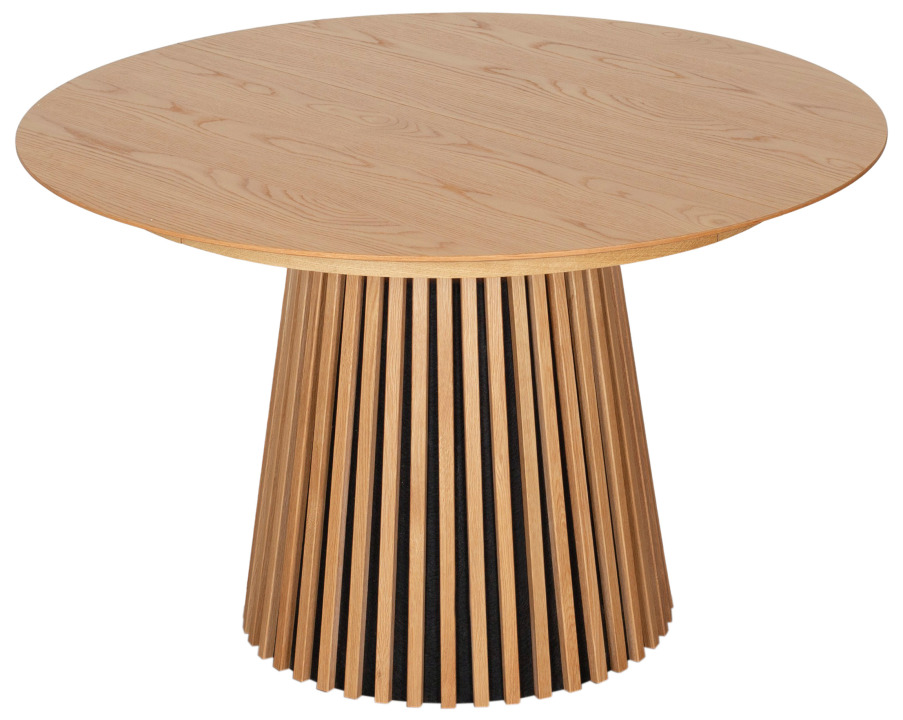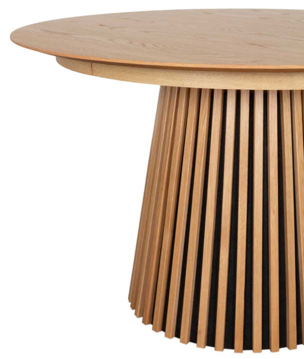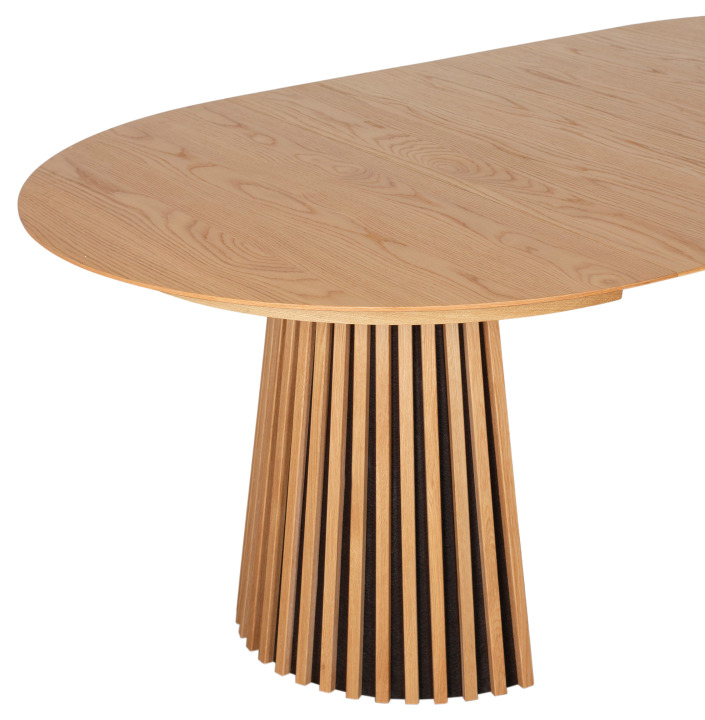 Der Esstisch Oria Natur Oak oval 210 x 120 cm zeigt, wie inspirierend Naturmaterialien wirken können. Die Tischplatte mit hochwertigem Eichenfurnier wirkt warm, ruhig und wertig, während das stabile Gestell aus Natureiche in Lamellenoptik handwerkliche Tiefe ausstrahlt. Durch die klare Linienführung und das hochwertige Vollholz fügt sich der Tisch harmonisch in moderne wie zeitlose Interieurs ein.