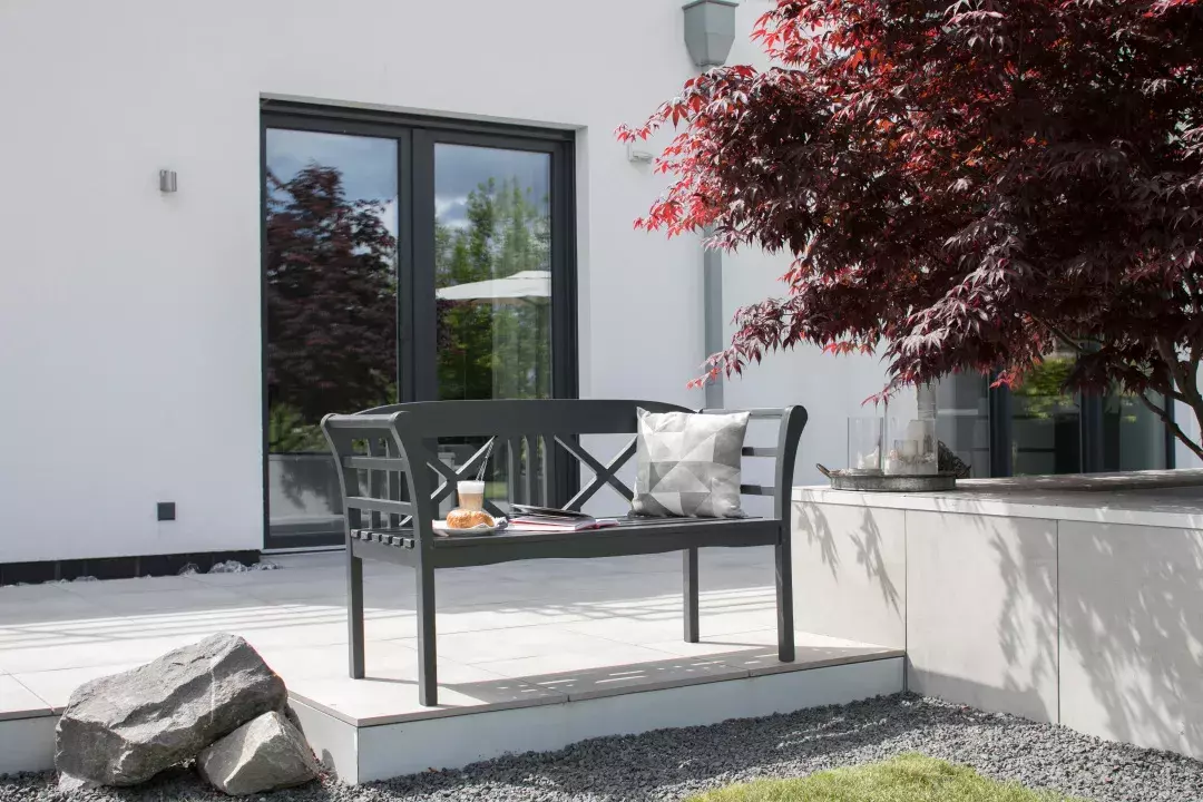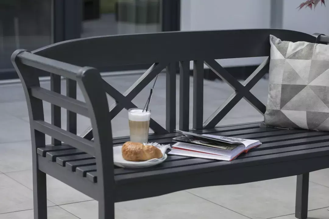 Die angenehm gebogenen Flächen sorgen für ein ruhiges, ergonomisches Sitzerlebnis und unterstützen lange Abende im Freien ebenso wie kurze ruhige Zwischennoten. Gleichzeitig bleibt die Gartenbank wetterfest und zeigt sich auch bei Sonne, Regen und kühleren Nächten verlässlich pflegeleicht.