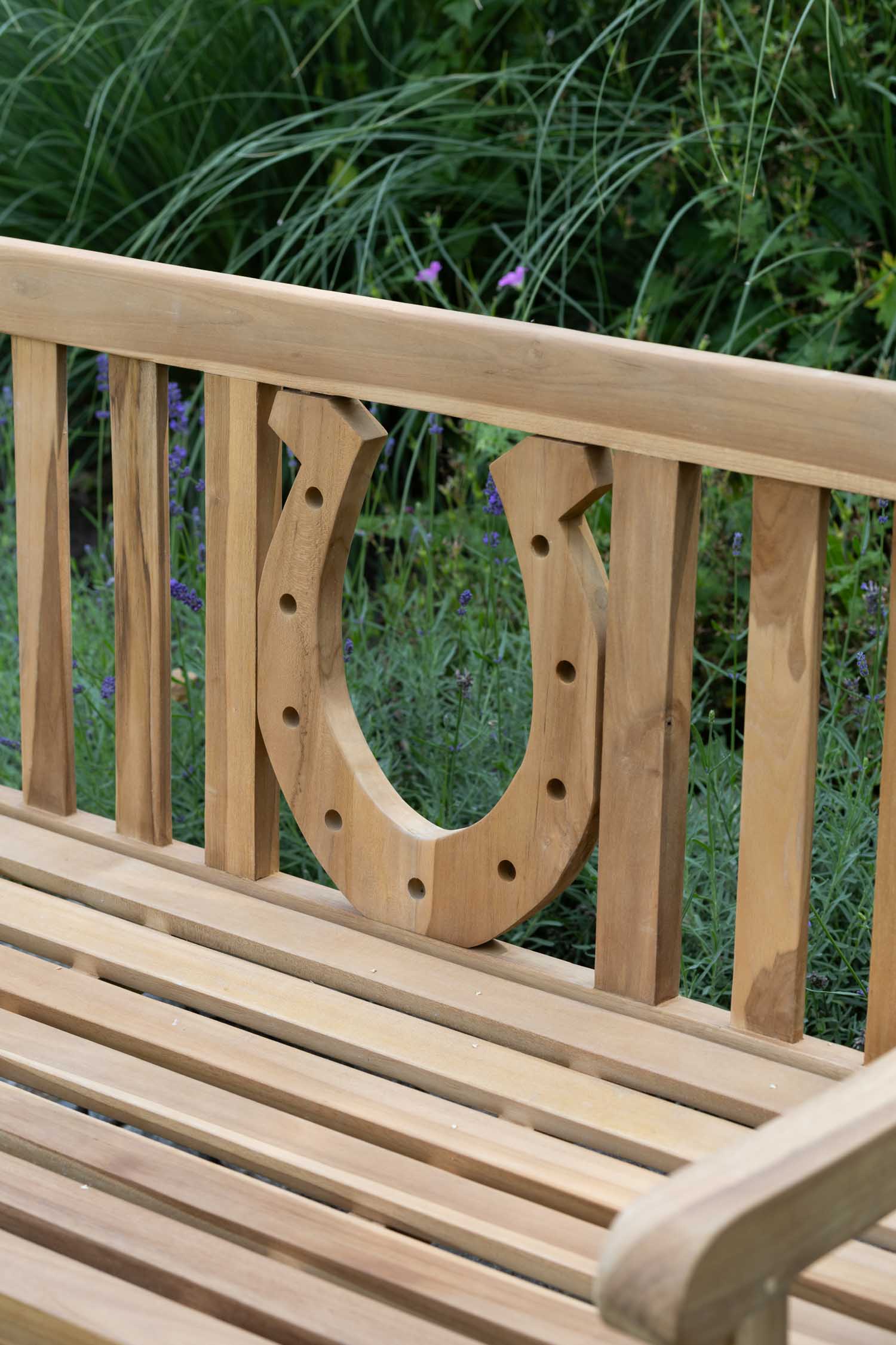 Ein besonderes Highlight dieser Gartenbank ist das ergonomisch geformte Rücken- und Sitzflächen-Design, das höchsten Sitzkomfort garantiert. Lange Gespräche mit Freunden oder ein entspannter Moment mit einem Buch sind mit dieser Bank besonders angenehm. Das liebevoll eingearbeitete Hufeisen-Motiv im Rückenteil verleiht der Bank eine ganz individuelle Note und sorgt für einen rustikalen Charme.