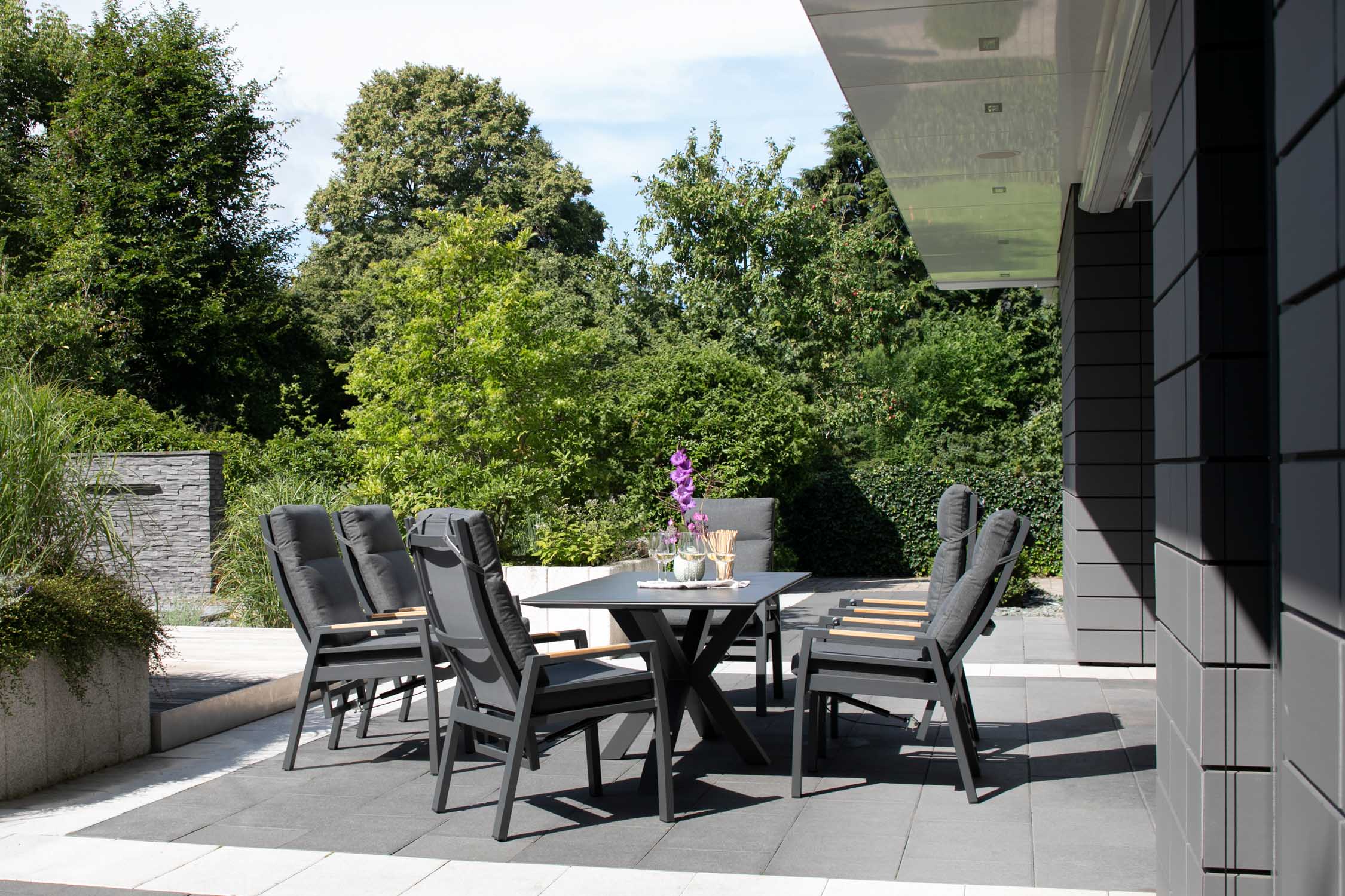 - Das Set besteht aus 1x Tisch Granada und 6x Relaxsesseln Sevilla mit verstellbarer Rückenlehne, ideal für Terrasse, Garten und Balkon