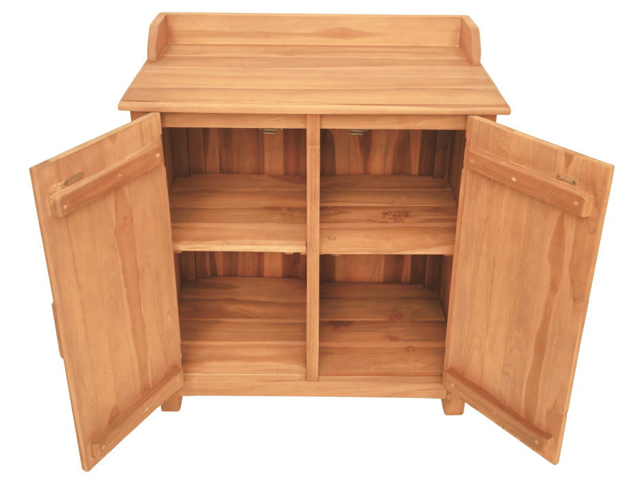 Der Gartenschrank Batley Teak mit Arbeitsfläche besteht aus zertifiziertem Plantagen Vollholz Teak, das durch seine glatte Oberfläche ein angenehmes haptisches Erlebnis bietet und gleichzeitig robust wirkt. Das Material ist von Natur aus witterungsbeständig gegen Sonne und Regen und damit wie geschaffen für die Nutzung im Freien. Die kompakten Maße von etwa 90 cm Breite, 80 cm Höhe und 45 cm Tiefe machen den Schrank flexibel platzierbar und vielseitig nutzbar – als Tisch, Stauraum und Regal zugleich.