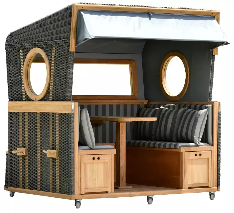 In der Gastronomie steht Funktionalität an erster Stelle. Ein Strandkorb für die Außengastronomie sollte neben hohem Sitzkomfort auch praktische Features bieten: integrierte Ablageflächen, herausnehmbare Tische, Halter für Getränke oder Speisekarten, Stauraum für Decken oder Kissen und vor allem eine gut zugängliche Sitzfläche. Modelle mit breiter Einstiegsmöglichkeit sind besonders gefragt, da sie auch von älteren Gästen oder Menschen mit körperlichen Einschränkungen bequem genutzt werden können.