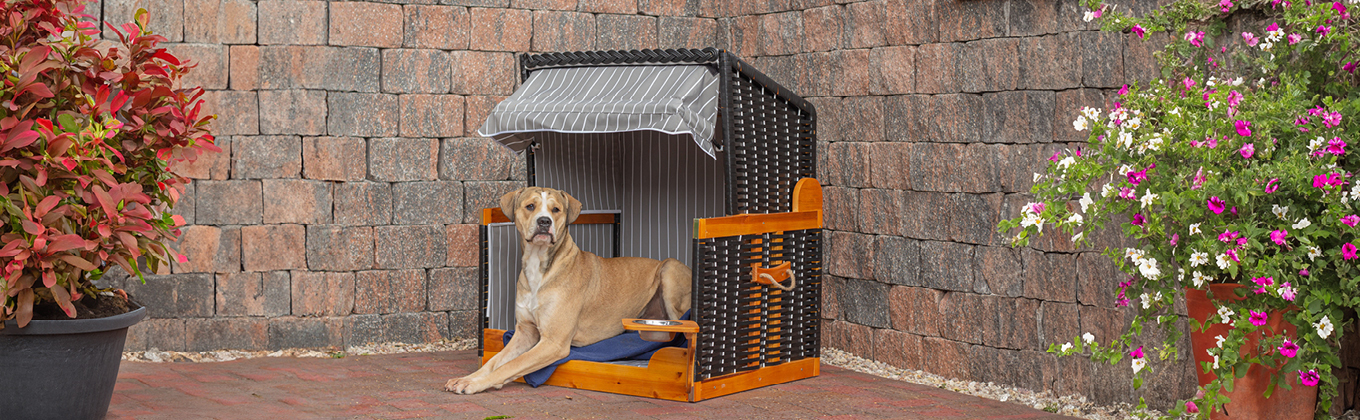 Im Außenbereich punktet der Hundestrandkorb durch seine wetterfeste Konstruktion. Die Materialien sind so gewählt, dass sie Regen, Sonne und Schmutz trotzen. Die Haube schützt vor direkter UV-Strahlung, während die Lüftung durch die offene Front erhalten bleibt. Viele Modelle haben zudem eine erhöhte Bodenplatte, die das Eindringen von Feuchtigkeit verhindert – perfekt für Aufstellung auf Rasen, Kies oder Holzterrasse.