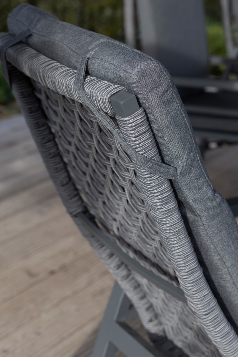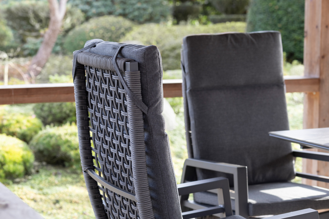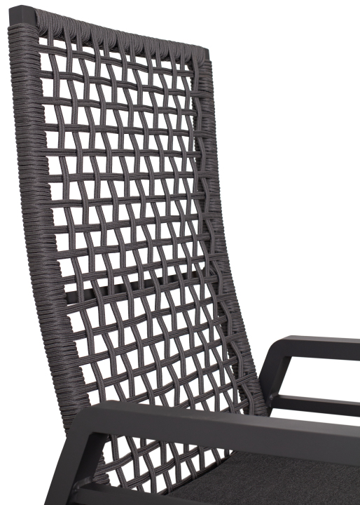 Der Relaxsessel Lucena setzt auf einen wetterfesten Aluminiumrahmen mit hochwertiger Pulverbeschichtung und kombiniert ihn mit luftdurchlässigem, schnelltrocknendem Rope sowie Textilenegewebe unter dem Kissen. Die Armlehnen sind so gestaltet, dass sie problemlos unter gängige Gartentische passen. Das anthrazitfarbene Sitzkissen ist waschbar, angenehm solide gefertigt und verleiht dem Gesamtdesign einen ruhigen, stilvollen Ausdruck.