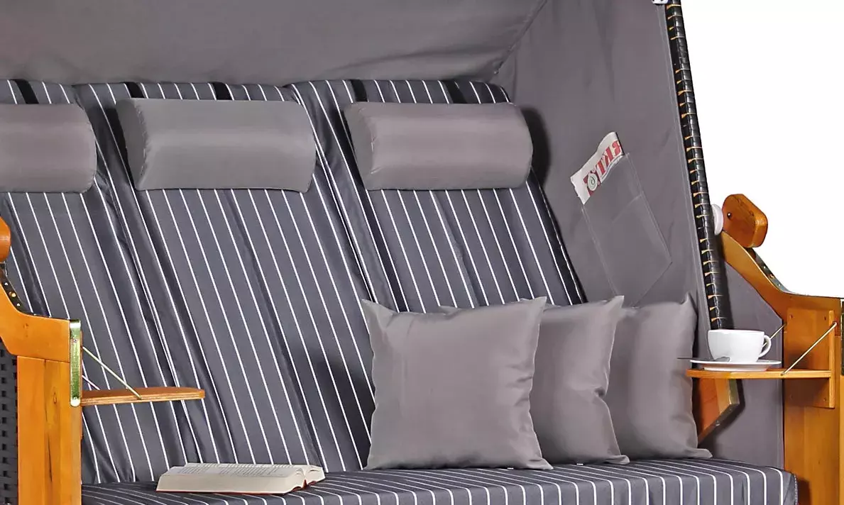 Die Strandkorbserie Baltic Dreisitzer überzeugt nicht nur durch die verwendeten Materialen, sondern auch durch die vielen durchdachten Extras, die bereits im Preis inbegriffen sind. Der Strandkorb Baltic Dreisitzer verfügt über ausziehbare Fußstützen mit bequemer Polsterauflage im Kissendessin, einen mehrfach verstellbaren Oberkorb und bequeme Rücken- und Sitzkissen. Zudem liefern wir Ihnen den Strandkorb Baltic Dreisitzer inklusive passender Wurf- und Nackenkissen. Die Nackenkissen können Sie zudem in der Höhe verstellen, sodass Sie immer die richtige Sitzposition haben, egal ob beim Lesen, Kaffee trinken oder bei einem entspannten Mittagsschläfchen. Die Bezüge der Wurf- und Nackenkissen verfügen über Reißverschlüsse und lassen sich in der Waschmaschine reinigen. Alle Polsterbezüge sind aus strapzierfähigem und schmutzabweisendem Markisenstoff, der sich vor allem bei häufiger Benutzung bewährt hat. Doch auch an das Verstauen von Zeitung und Mobiltelefon wurde gedacht. Die beiden im Kissendesign angefertigten Taschen an den Innenseiten bieten Ihnen Platz für alle was Sie momentan nicht benötigen. Kurzum, der Strandkorb Baltic hat alles zu bieten, was ein klassischer Strandkorb benötigt - Überzeugen Sie sich selbst!