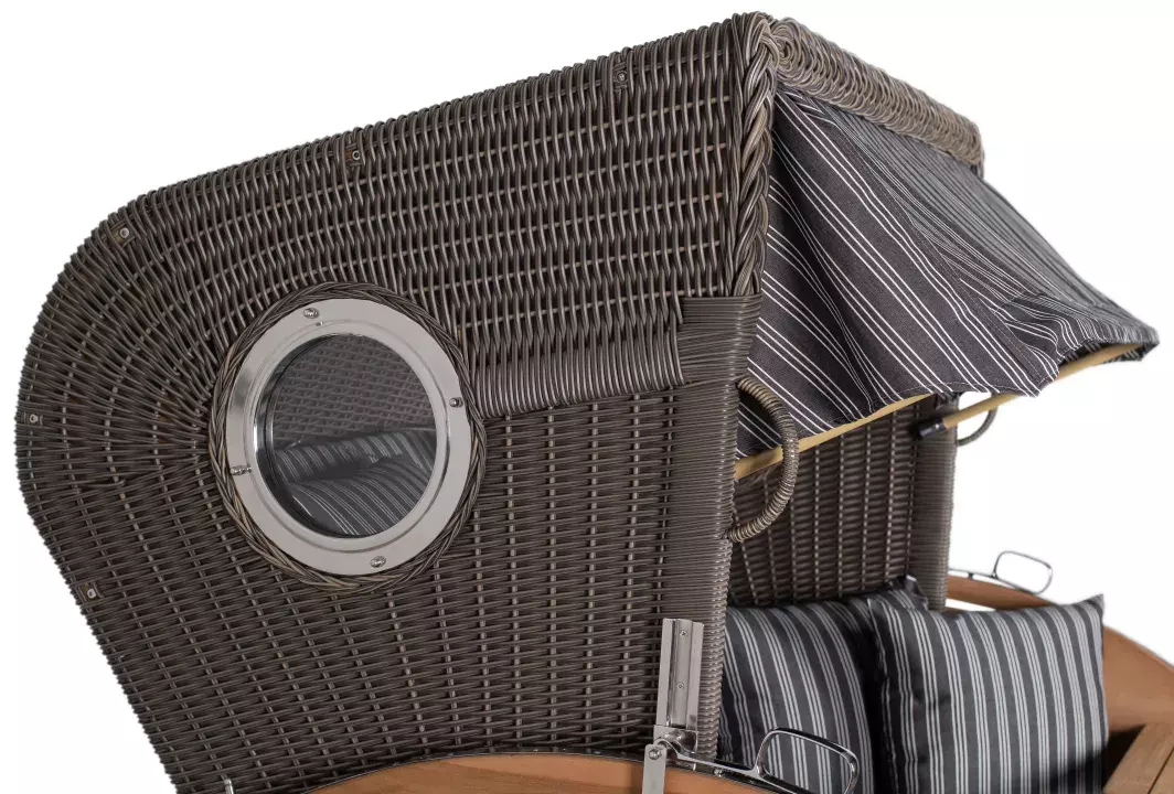 Durch sein edles PE-Geflecht PE grey erhält der Strandkorb nicht nur eine gehobene Optik. Das Material ist UV- und witterungsbeständig, so dass Sie denStrandkorb dauerhaft bei Wind und Wetter im Außenbereich stehen lassen können. Die zwischen Aussengeflecht und dem inneren Geflecht eingearbeitete Windschutzfolie bietet gemütlichen Schutz und trägt zusätzlich zum Werterhalt des Strandkorbes bei - so haben Sie über Jahre hinweg Freude an diesem einzigartigen Gartenmöbel.