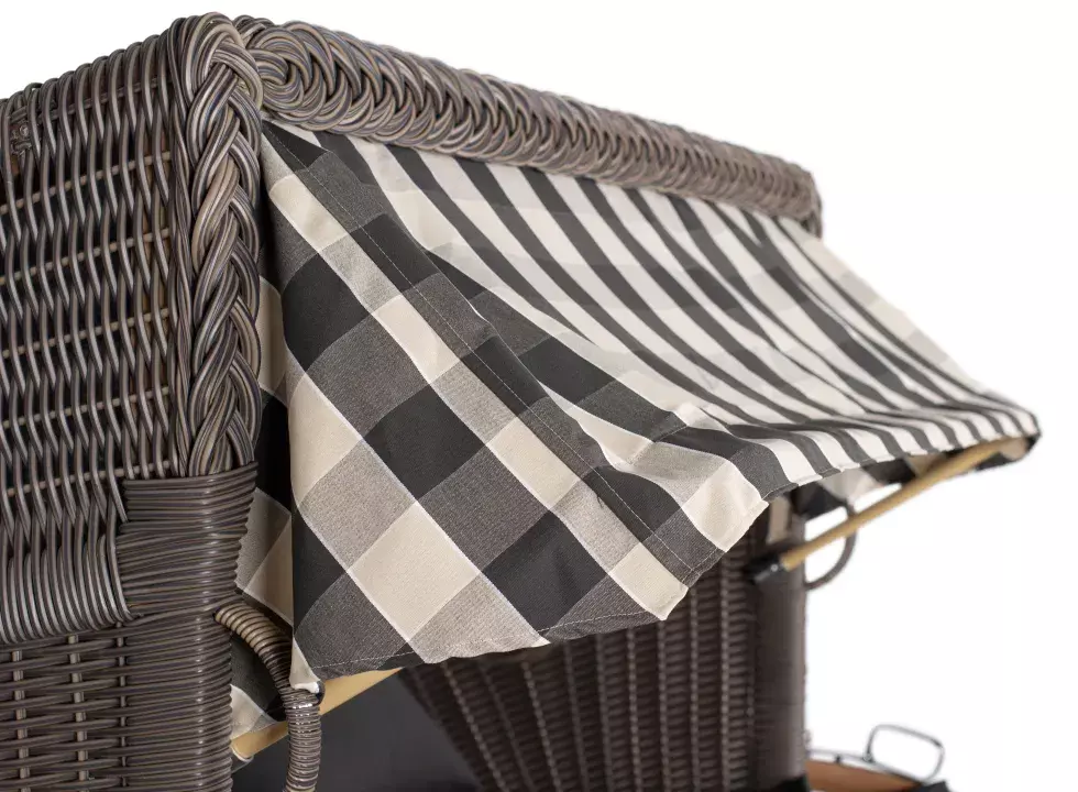 Durch sein edles PE-Geflecht PE grey erhält der Strandkorb nicht nur eine gehobene Optik. Das Material ist UV- und witterungsbeständig, so dass Sie denStrandkorb dauerhaft bei Wind und Wetter im Außenbereich stehen lassen können. Die zwischen Aussengeflecht und dem inneren Geflecht eingearbeitete Windschutzfolie bietet gemütlichen Schutz und trägt zusätzlich zum Werterhalt des Strandkorbes bei - so haben Sie über Jahre hinweg Freude an diesem einzigartigen Gartenmöbel.