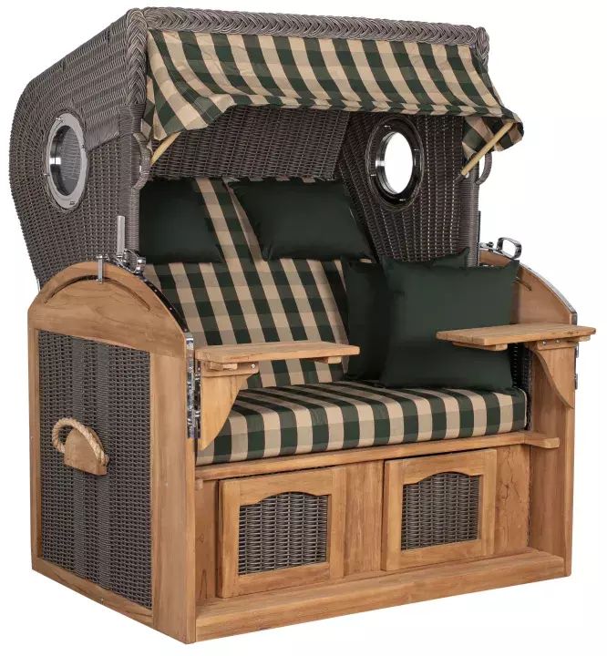 Mit diesem Strandkorb machen Sie es sich zusammen mit Ihrem Partner im Garten oder auf der Terrasse gemütlich. Das edle Teak Holz und die dunkle, grau-braun melierte Farbgebung des Geflechtes PE Grey verleihen dem Strandkorb einen eleganten und hochwertigen Charme. Die Fußstützen sind in Schubladenform gearbeitet, je nach Ausstattung können Sie den Korb auch als Vollieger nutzen. In unserem Shop bestellen Sie den nordischen Blickfang mit optionalem Zubehör zum attraktiven Bestellpreis.