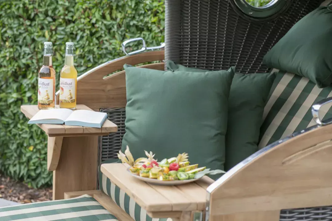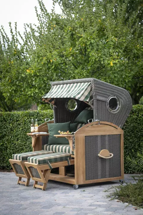 Mit der Verbindung aus Teak Holz, Polyrattan und hochwertigen metallischen Beschlägen genießen Sie den Komfort des Zweieinhalbsitzers über viele Jahre hinweg. Durch die integrierte Kissenausstattung können Sie den Strandkorb direkt nach der Lieferung nutzen und Ihre Freizeit mit Snacks, Getränken und einem guten Buch genießen.