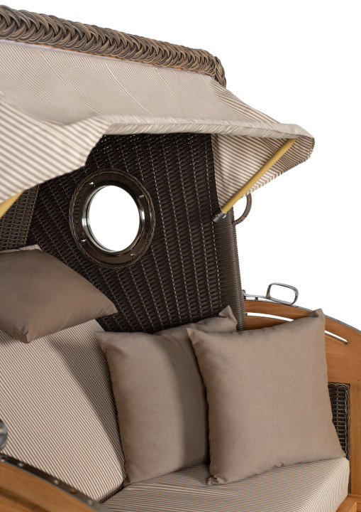 Ein weiteres Highlight: Der Strandkorb Horum XL ist mit 2 Bullaugen ausgestattet. Optional ist ein Lifter System bestellbar zur bequemen Verstellung des Oberkorbes in die einzelnen Liegepositionen. Vom erstklassigen Windschutz bis zum Vollieger bringen Sie den Korb so ohne Mühen in die gewünschte Stellung und genießen den Aufenthalt in Ihrem Garten in fast allen Jahreszeiten und Wetterlagen. Zwei praktische Bistrotische aus Teak Holz und die ausziehbaren Fußstützen steigern den Komfort des Strandkorbes zusätzlich.