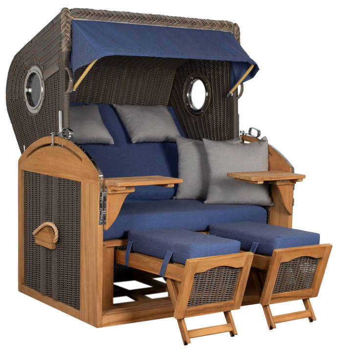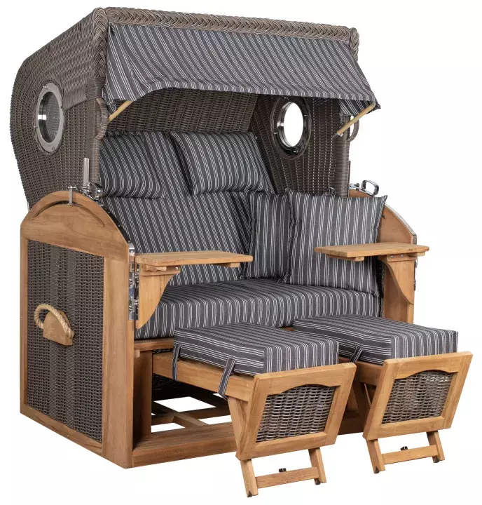 Unser neuer Volllieger für Ihren Garten - großer 2,5-Sitzer Strandkorb in Nordseeform aus Teakholz mit ausziehbaren Fußstützen