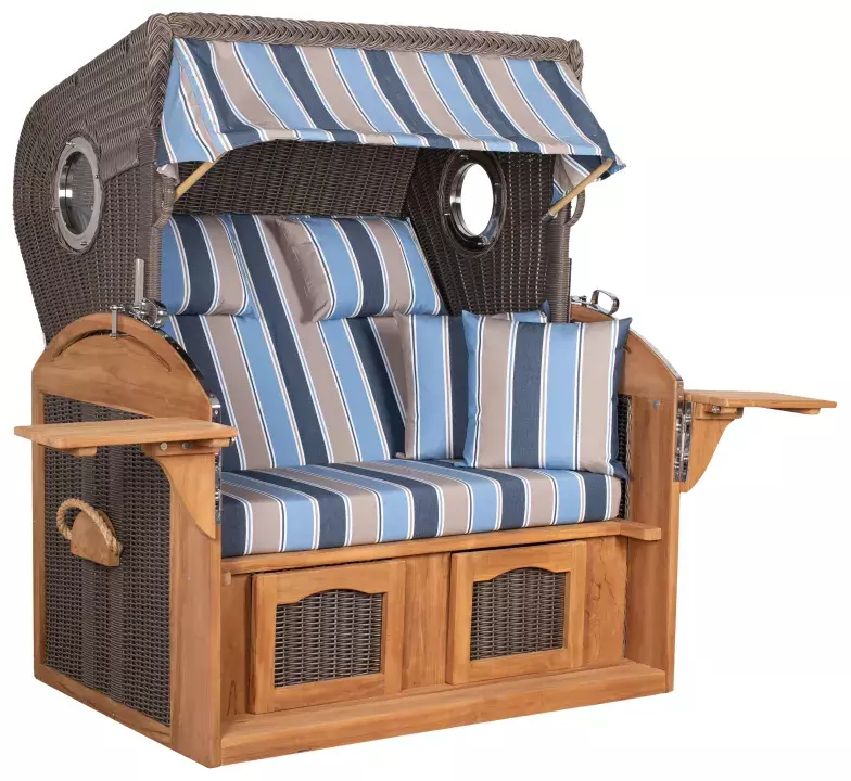 Unser neuer Volllieger für Ihren Garten - großer 2,5-Sitzer Strandkorb in Nordseeform aus Teakholz mit ausziehbaren Fußstützen