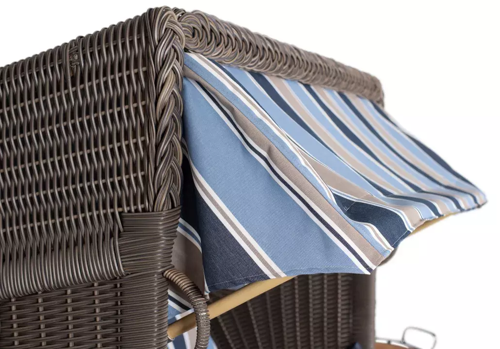 Durch sein edles PE-Geflecht PE grey erhält der Strandkorb nicht nur eine gehobene Optik. Das Material ist UV- und witterungsbeständig, so dass Sie denStrandkorb dauerhaft bei Wind und Wetter im Außenbereich stehen lassen können. Die zwischen Aussengeflecht und dem inneren Geflecht eingearbeitete Windschutzfolie bietet gemütlichen Schutz und trägt zusätzlich zum Werterhalt des Strandkorbes bei - so haben Sie über Jahre hinweg Freude an diesem einzigartigen Gartenmöbel.