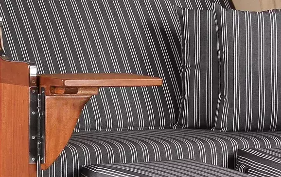 Dass für den Strandkorb Nordstrand verwendete Mahagoniholz überzeugt durch seinen edlen, rötlich-braunen Farbton, der dem Strandkorb seinen klassischen und maritimen Charakter verleiht. Zudem sorgt das massive Mahagoniholz für Standfestigkeit und Stabiltität und macht den Strandkorb Nordstrand zu einem hochwertigen Gartenmöbel. Die Verwendung von Mahagoniholz im Außenbereich hat eine lange Tradition. Das besonders harte und damit witterungsbeständige Holz wird von jeher sowohl im Schiffsbau als auch im Gartenbereich eingesetzt. Somit eignet es sich auch für die Herstellung von Strandkörben besonders gut. Um das Mahagoniholz in seiner einzigartigen Optik zu erhalten, empfehlen wir die regelmäßige Lackierung des Holzes mit einem offenporigen PU-Lack. Diese Pflege macht den Strandkorb Nordstrand zu einem absoluten Highlight in Ihrem Garten oder auf Ihrer Terrasse!