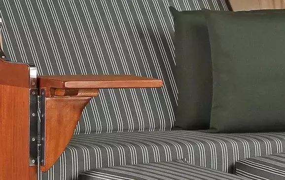 Dass für den Strandkorb Nordstrand verwendete Mahagoniholz überzeugt durch seinen edlen, rötlich-braunen Farbton, der dem Strandkorb seinen klassischen und maritimen Charakter verleiht. Zudem sorgt das massive Mahagoniholz für Standfestigkeit und Stabiltität und macht den Strandkorb Nordstrand zu einem hochwertigen Gartenmöbel. Die Verwendung von Mahagoniholz im Außenbereich hat eine lange Tradition. Das besonders harte und damit witterungsbeständige Holz wird von jeher sowohl im Schiffsbau als auch im Gartenbereich eingesetzt. Somit eignet es sich auch für die Herstellung von Strandkörben besonders gut. Um das Mahagoniholz in seiner einzigartigen Optik zu erhalten, empfehlen wir die regelmäßige Lackierung des Holzes mit einem offenporigen PU-Lack. Diese Pflege macht den Strandkorb Nordstrand zu einem absoluten Highlight in Ihrem Garten oder auf Ihrer Terrasse!