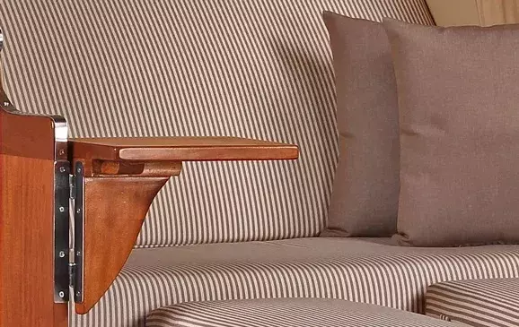 Dass für den Strandkorb Nordstrand verwendete Mahagoniholz überzeugt durch seinen edlen, rötlich-braunen Farbton, der dem Strandkorb seinen klassischen und maritimen Charakter verleiht. Zudem sorgt das massive Mahagoniholz für Standfestigkeit und Stabiltität und macht den Strandkorb Nordstrand zu einem hochwertigen Gartenmöbel. Die Verwendung von Mahagoniholz im Außenbereich hat eine lange Tradition. Das besonders harte und damit witterungsbeständige Holz wird von jeher sowohl im Schiffsbau als auch im Gartenbereich eingesetzt. Somit eignet es sich auch für die Herstellung von Strandkörben besonders gut. Um das Mahagoniholz in seiner einzigartigen Optik zu erhalten, empfehlen wir die regelmäßige Lackierung des Holzes mit einem offenporigen PU-Lack. Diese Pflege macht den Strandkorb Nordstrand zu einem absoluten Highlight in Ihrem Garten oder auf Ihrer Terrasse!