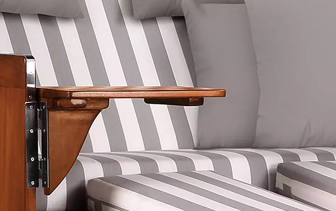 Neben dem massiven Teakholz und beständigen PE-Geflecht verwenden wir für unseren Strandkorb Nordstrand ausschließlich hochwertige Edelstahlbeschläge aus V2A-Edelstahl. Diese Beschläge kommen bei der Befestigung der Bistrotische, der Verstärkung der unteren Ecken und beim Feststellmechanismus der Verstellgriffe zum Einsatz. Doch auch die verwendeten Schrauben, sowie die Haken zur Befestigung der abnehmbaren Fußstützen sind bewusst aus Edelstahl gewählt. Komplettiert wird der Strandkorb Nordstrand durch eine Vielzahl durchdachter Extras. Das großzügige Staufach unter der Sitzbank, die beiden Zeitungstaschen und die großen schwenkbaren Bistrotische sind praktische Details, die Ihre Auszeit im Strandkorb Nordstrand perfekt machen. Zudem sorgen extradicke Polster für einen bequemen Sitzkomfort. Der Strandkorb Nordstrand wird grundsätzlich mit farblich abgestimmten Wurf- und Nackenkissen geliefert, die sich variabel einsetzen lassen. Somit lässt der Strandkorb Nordstrand keine Wünsche offen - lassen Sie sich von unserer vielfältigen Auswahl inspirieren!