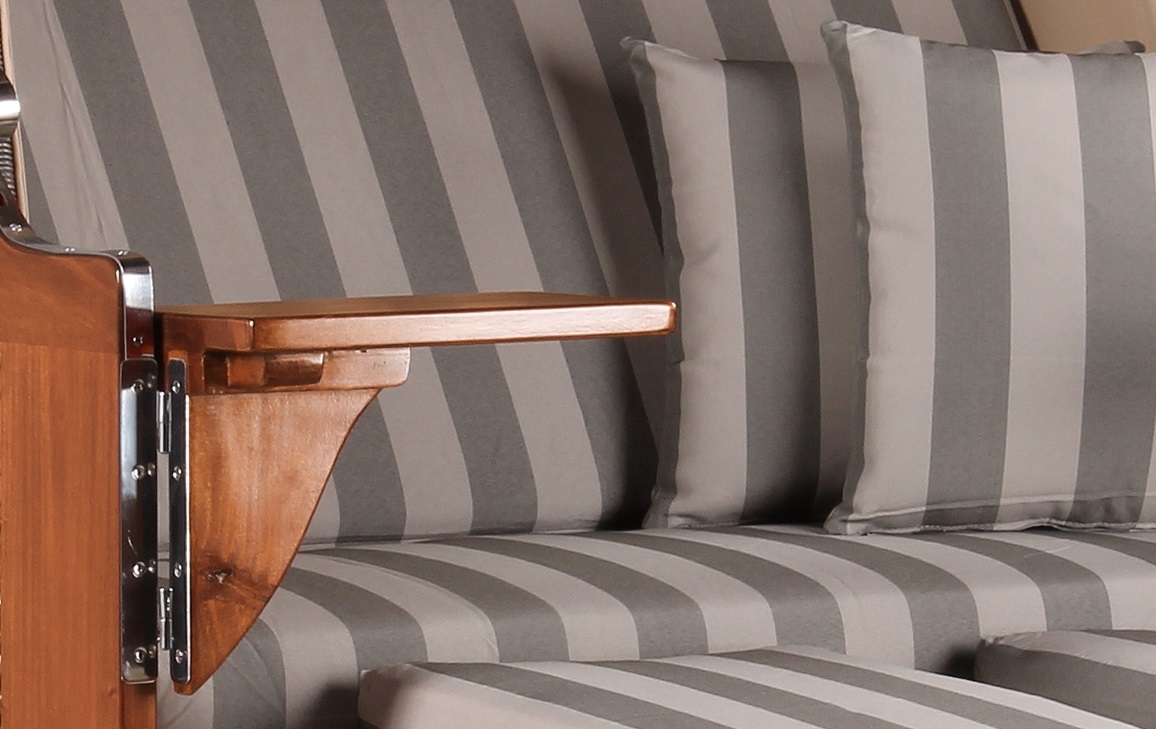 Dass für den Strandkorb Nordstrand verwendete Mahagoniholz überzeugt durch seinen edlen, rötlich-braunen Farbton, der dem Strandkorb seinen klassischen und maritimen Charakter verleiht. Zudem sorgt das massive Mahagoniholz für Standfestigkeit und Stabiltität und macht den Strandkorb Nordstrand zu einem hochwertigen Gartenmöbel. Die Verwendung von Mahagoniholz im Außenbereich hat eine lange Tradition. Das besonders harte und damit witterungsbeständige Holz wird von jeher sowohl im Schiffsbau als auch im Gartenbereich eingesetzt. Somit eignet es sich auch für die Herstellung von Strandkörben besonders gut. Um das Mahagoniholz in seiner einzigartigen Optik zu erhalten, empfehlen wir die regelmäßige Lackierung des Holzes mit einem offenporigen PU-Lack. Diese Pflege macht den Strandkorb Nordstrand zu einem absoluten Highlight in Ihrem Garten oder auf Ihrer Terrasse!