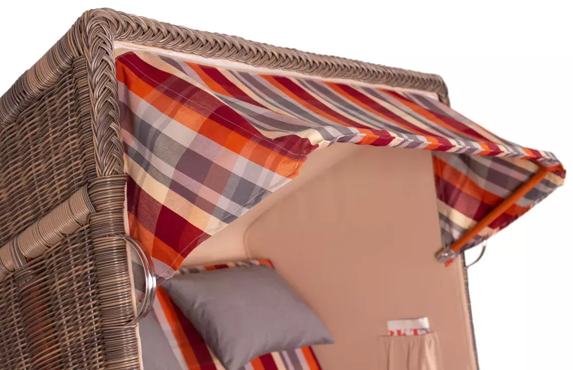 Die aufwendig gestaltete Flechtung des Strandkorbes wird in liebevoller Handarbeit für jeden Strandkorb einzeln erstellt. Die interessante Sonnenflechtung des Seitenteils und die akkurate Verarbeitung der Oberkorbs zeugen von hohem handwerklichem Geschick und verleihen dem Strandkorb Nordstrand sein klassisches Design. Das verwendete PE (Polyethylen)-Geflecht ist ideal für den Einsatz im Freien, denn es ist robust und temperaturbeständig, besonders auch bei hohen Temperaturschwankungen. Zudem ist die glatte Oberfläche des Geflechtes schmutz- und witterungsabweisend. Weitere Vorteile wie UV-Beständigkeit und Farbechtheit machen Ihren Strandkorb Nordstrand zu einem langjährigen Begleiter, an dem Sie lange Ihre Freude haben werden!