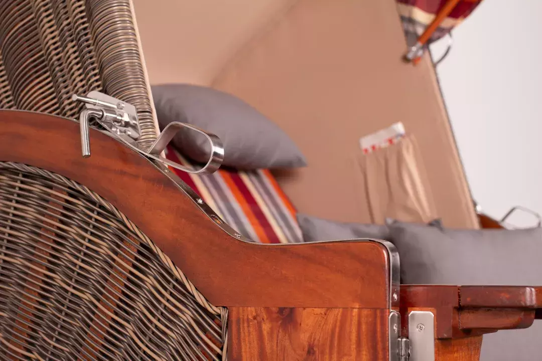 Dass für den Strandkorb Nordstrand verwendete Mahagoniholz überzeugt durch seinen edlen, rötlich-braunen Farbton, der dem Strandkorb seinen klassischen und maritimen Charakter verleiht. Zudem sorgt das massive Mahagoniholz für Standfestigkeit und Stabiltität und macht den Strandkorb Nordstrand zu einem hochwertigen Gartenmöbel. Die Verwendung von Mahagoniholz im Außenbereich hat eine lange Tradition. Das besonders harte und damit witterungsbeständige Holz wird von jeher sowohl im Schiffsbau als auch im Gartenbereich eingesetzt. Somit eignet es sich auch für die Herstellung von Strandkörben besonders gut. Um das Mahagoniholz in seiner einzigartigen Optik zu erhalten, empfehlen wir die regelmäßige Lackierung des Holzes mit einem offenporigen PU-Lack. Diese Pflege macht den Strandkorb Nordstrand zu einem absoluten Highlight in Ihrem Garten oder auf Ihrer Terrasse!