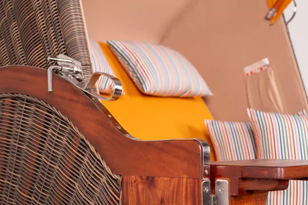 Neben dem massiven Teakholz und beständigen PE-Geflecht verwenden wir für unseren Strandkorb Nordstrand ausschließlich hochwertige Edelstahlbeschläge aus V2A-Edelstahl. Diese Beschläge kommen bei der Befestigung der Bistrotische, der Verstärkung der unteren Ecken und beim Feststellmechanismus der Verstellgriffe zum Einsatz. Doch auch die verwendeten Schrauben, sowie die Haken zur Befestigung der abnehmbaren Fußstützen sind bewusst aus Edelstahl gewählt. Komplettiert wird der Strandkorb Nordstrand durch eine Vielzahl durchdachter Extras. Das großzügige Staufach unter der Sitzbank, die beiden Zeitungstaschen und die großen schwenkbaren Bistrotische sind praktische Details, die Ihre Auszeit im Strandkorb Nordstrand perfekt machen. Zudem sorgen extradicke Polster für einen bequemen Sitzkomfort. Der Strandkorb Nordstrand wird grundsätzlich mit farblich abgestimmten Wurf- und Nackenkissen geliefert, die sich variabel einsetzen lassen. Somit lässt der Strandkorb Nordstrand keine Wünsche offen - lassen Sie sich von unserer vielfältigen Auswahl inspirieren!