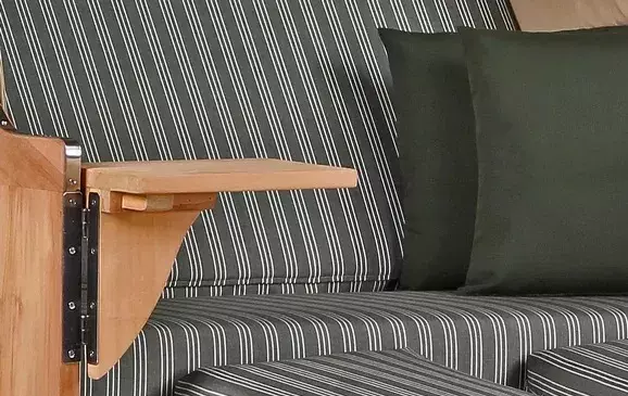 Dass für den Strandkorb Nordstrand verwendete Teakholz überzeugt durch seinen hellen, warmen Farbton, der dem Strandkorb seinen hochwertigen Charakter verleiht. Zudem sorgt das massive Teakholz für Standfestigkeit und Stabiltität. Teakholz ist ein besonders hochwertiges Holz und eignet sich aufgrund seiner natürlichen Eigenschaften hervorragend für Strandkörbe. Wir verwenden ausschließlich nachhaltig produziertes Plantagen-Teakholz. Aufgrund seines hohen Öl- und Kautschukanteils hat Teakholz einen natürlichen Verwitterungs- und Alterungsschutz. Egal ob Sie die im Laufe der Zeit entstehende silbrig-graue Patina lieben oder den natürlichen hellen Farbton bevorzugen, der sich durch regelmäßiges Ölen des Holzes erhalten lässt - unser Teakholz überzeugt durch seine Langlebigkeit und die hochwertige Optik!