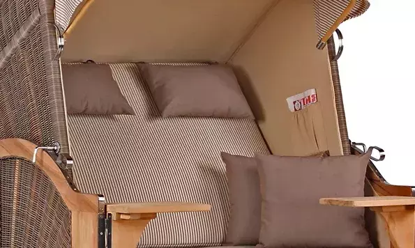 Neben dem massiven Teakholz und beständigen PE-Geflecht verwenden wir für unseren Strandkorb Nordstrand ausschließlich hochwertige Edelstahlbeschläge aus V2A-Edelstahl. Diese Beschläge kommen bei der Befestigung der Bistrotische, der Verstärkung der unteren Ecken und beim Feststellmechanismus der Verstellgriffe zum Einsatz. Doch auch die verwendeten Schrauben, sowie die Haken zur Befestigung der abnehmbaren Fußstützen sind bewusst aus Edelstahl gewählt. Komplettiert wird der Strandkorb Nordstrand durch eine Vielzahl durchdachter Extras. Das großzügige Staufach unter der Sitzbank, die beiden Zeitungstaschen und die großen schwenkbaren Bistrotische sind praktische Details, die Ihre Auszeit im Strandkorb Nordstrand perfekt machen. Zudem sorgen extradicke Polster für einen bequemen Sitzkomfort. Der Strandkorb Nordstrand wird grundsätzlich mit farblich abgestimmten Wurf- und Nackenkissen geliefert, die sich variabel einsetzen lassen. Somit lässt der Strandkorb Nordstrand keine Wünsche offen - lassen Sie sich von unserer vielfältigen Auswahl inspirieren!