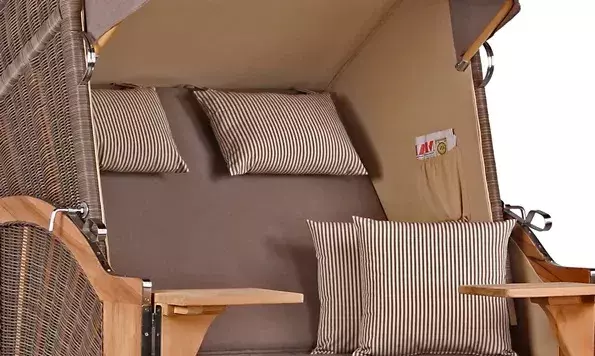Neben dem massiven Teakholz und beständigen PE-Geflecht verwenden wir für unseren Strandkorb Nordstrand ausschließlich hochwertige Edelstahlbeschläge aus V2A-Edelstahl. Diese Beschläge kommen bei der Befestigung der Bistrotische, der Verstärkung der unteren Ecken und beim Feststellmechanismus der Verstellgriffe zum Einsatz. Doch auch die verwendeten Schrauben, sowie die Haken zur Befestigung der abnehmbaren Fußstützen sind bewusst aus Edelstahl gewählt. Komplettiert wird der Strandkorb Nordstrand durch eine Vielzahl durchdachter Extras. Das großzügige Staufach unter der Sitzbank, die beiden Zeitungstaschen und die großen schwenkbaren Bistrotische sind praktische Details, die Ihre Auszeit im Strandkorb Nordstrand perfekt machen. Zudem sorgen extradicke Polster für einen bequemen Sitzkomfort. Der Strandkorb Nordstrand wird grundsätzlich mit farblich abgestimmten Wurf- und Nackenkissen geliefert, die sich variabel einsetzen lassen. Somit lässt der Strandkorb Nordstrand keine Wünsche offen - lassen Sie sich von unserer vielfältigen Auswahl inspirieren!