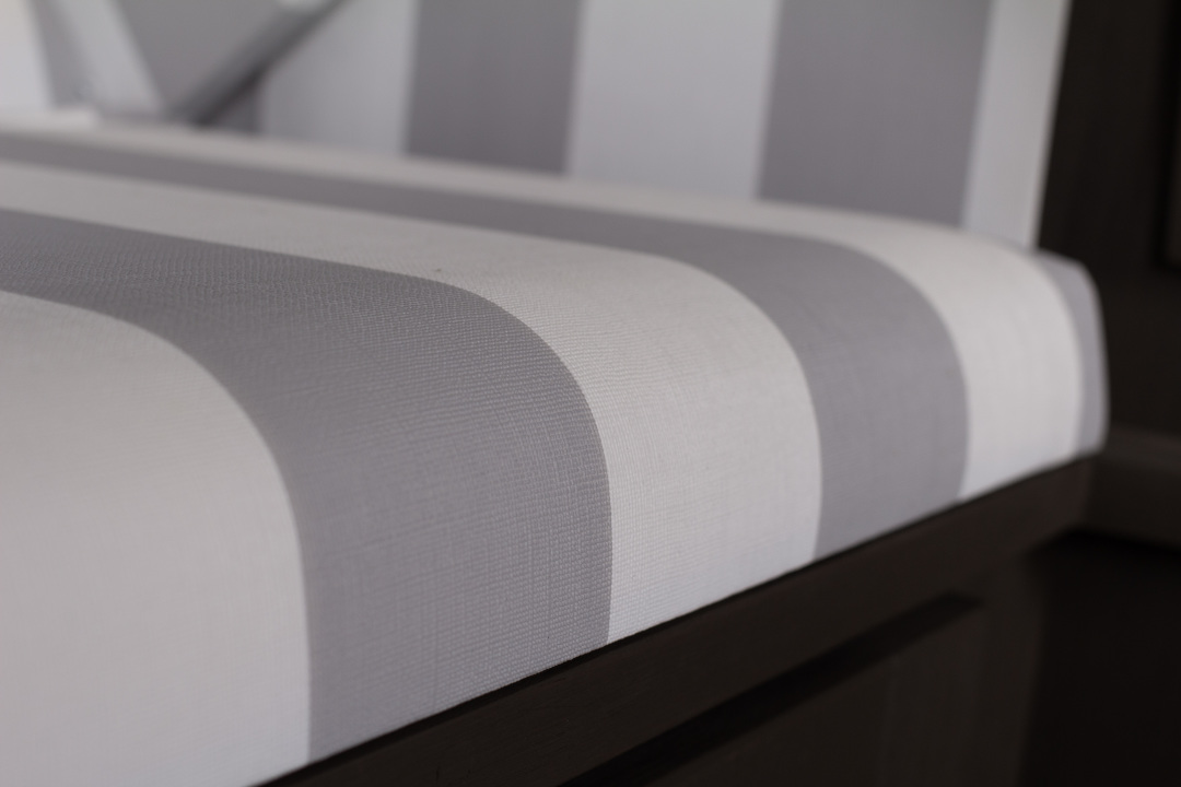 Ein Strandkorb Profi Ostsee Fehmarn PE grey Dessin 989 ist die perfekte Ergänzung für jeden Garten oder Balkon. Mit seinem klassischen grau-weißen Streifenmuster und der Kombination aus modernem, grau lasierten Mahagoniholz und grauem 18mm PE-Markengeflecht, bringt er eine zeitlose Eleganz in jede Umgebung.