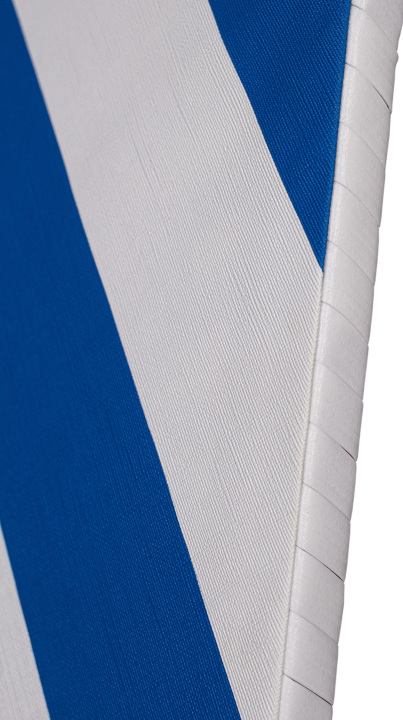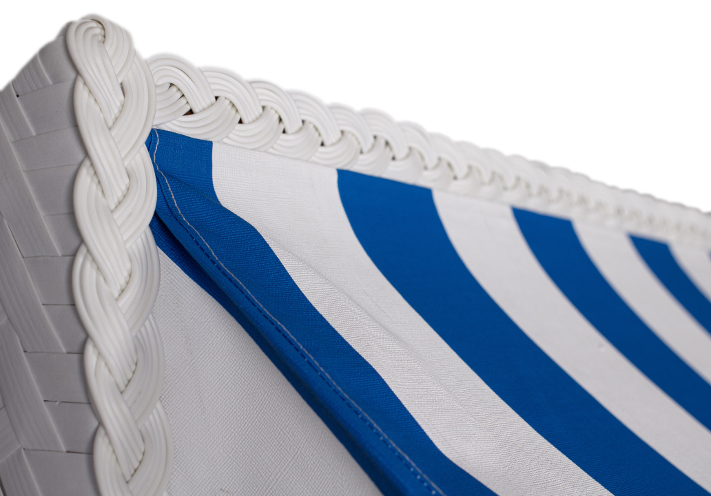 Der Strandkorb Profi Ostsee Fehmarn in Weiß mit dem zeitlosen blau-weißen Streifendessin 991 ist ein wahrer Blickfang und eine Bereicherung für jede gastronomische Einrichtung.
