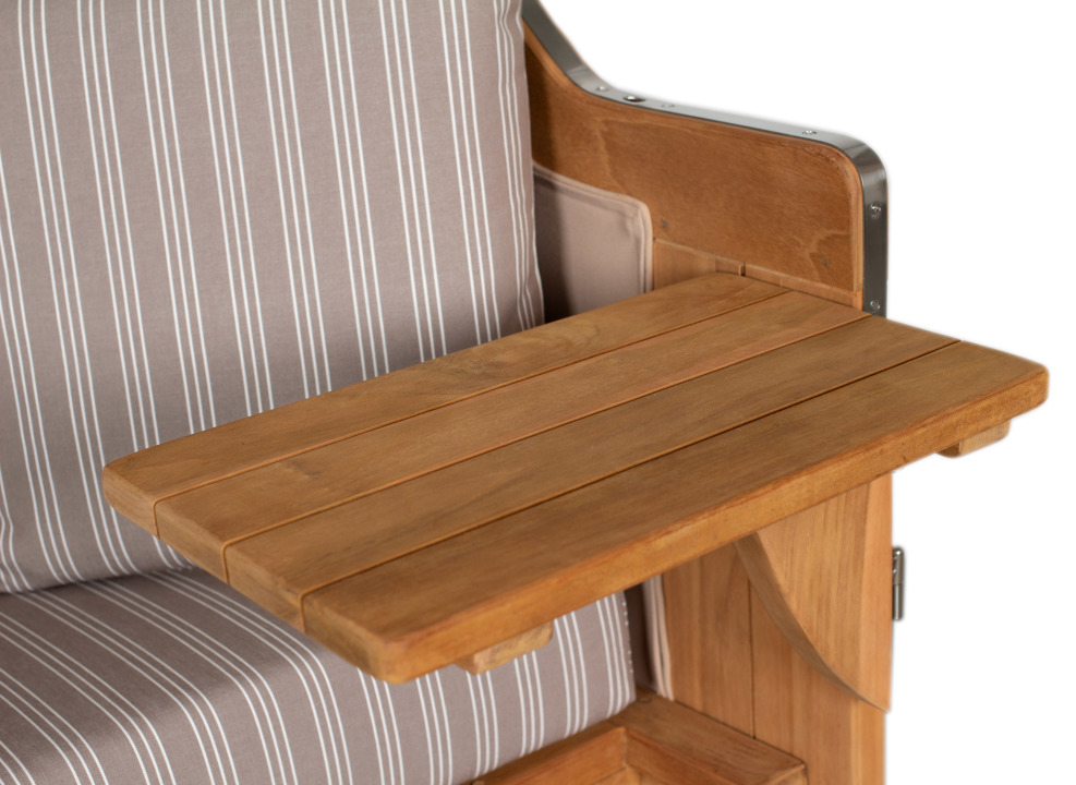 Neben dem massiven Teakholz und beständigen PE-Geflecht verwenden wir für unseren Strandkorb Rantum ausschließlich hochwertige Edelstahlbeschläge aus V2A-Edelstahl. Diese Beschläge kommen bei der Befestigung der Bistrotische, der Verstärkung der unteren Ecken und beim Feststellmechanismus der Verstellgriffe zum Einsatz. Komplettiert wird der Strandkorb Rantum durch eine Vielzahl durchdachter Extras. So verfügt der Strandkorb Rantum nicht nur über eine extra-dicke Polsterung, sondern auch über farblich passende Wurfkissen und verstellbare Nackenkissen. Zeitungstaschen, integrierte Armlehnen, zwei große, schwenkbare und zudem abnehmbare Bistrotische lassen keine Wünsche offen und machen den Strandkorb Rantum bald auch zu Ihrem Lieblingsplatz im Garten oder auf der Terrasse.