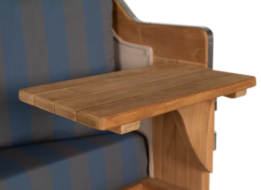 Neben dem massiven Teakholz und beständigen PE-Geflecht verwenden wir für unseren Strandkorb Rantum ausschließlich hochwertige Edelstahlbeschläge aus V2A-Edelstahl. Diese Beschläge kommen bei der Befestigung der Bistrotische, der Verstärkung der unteren Ecken und beim Feststellmechanismus der Verstellgriffe zum Einsatz. Komplettiert wird der Strandkorb Rantum durch eine Vielzahl durchdachter Extras. So verfügt der Strandkorb Rantum nicht nur über eine extra-dicke Polsterung, sondern auch über farblich passende Wurfkissen und verstellbare Nackenkissen. Zeitungstaschen, integrierte Armlehnen, zwei große, schwenkbare und zudem abnehmbare Bistrotische lassen keine Wünsche offen und machen den Strandkorb Rantum bald auch zu Ihrem Lieblingsplatz im Garten oder auf der Terrasse.