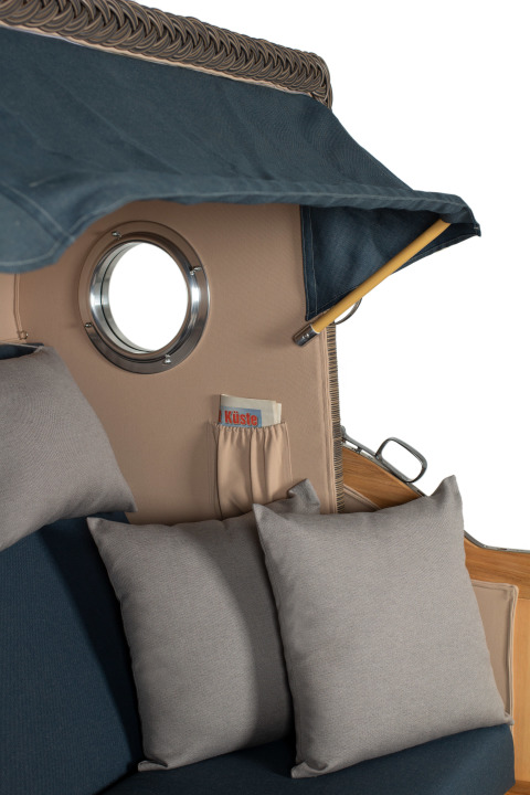 Nur die Nordsee ist schöner als dieser traumhafte Strandkorb, mit dem Sie sich maritimes Flair in den Garten holen. Der Strandkorb Rantum Grande macht seinem Namen alle Ehre: Edles Teakholz, Hochglanz-Bullaugen und eine üppige Polsterung machen den Volllieger zu einer wahren Wohlfühloase. Bei so viel Komfort kommt garantiert Urlaubsstimmung auf. Der Strandkorb Rantum Grande besticht mit einer durchdachten Mischung aus maritimen Details, hohem Komfort und luxuriöser Verarbeitung. Als Volllieger bietet der Strandkorb Rantum Grande ein Höchstmaß an Komfort. Auch in puncto Qualität genügt dieses Modell wie alle Strandkörbe der Rantum-Serie höchsten Ansprüchen. Der Strandkorb ist aus edlem Teakholz gefertigt und dadurch besonders widerstandsfähig gegenüber äußeren Witterungseinflüssen. Aufgelockert wird die massive Teak-Optik durch luftiges PE-Geflecht. Auch hierbei handelt es sich um ein sehr langlebiges und wetterfestes Material, das zudem schmutzabweisend und UV-beständig ist. Einem langjährigen intensiven Gebrauch steht also nichts im Wege. Das beidseitig eingelassene Bullauge zählt zu den besonderen Extras dieses Strandkorbes. Lehnen Sie sich zurück und genießen Sie den ungestörten Rundumblick, der an die Weiten von Nord- und Ostsee erinnert. Das Bullauge besteht aus Sicherheitsglas und ist in hochglänzendes Aluminium eingefasst. Damit bildet es die perfekte Ergänzung zu den übrigen Hochglanz-Beschlägen aus Edelstahl. Für einen optimalen Komfort verfügt der Strandkorb über eine großzügige Polsterung, bestehend aus extra dicken Sitz- und Fußkissen, Wurfkissen sowie Nackenkissen. Zwei schwenkbare Bistrotische und ausziehbare Fußbänke runden die üppige Ausstattung dieses Premium-Strandkorbes ab. Alle Bezüge bestehen aus hochwertigem Markisenstoff, sind abnehmbar und waschbar.