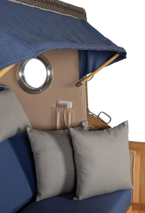 Nur die Nordsee ist schöner als dieser traumhafte Strandkorb, mit dem Sie sich maritimes Flair in den Garten holen. Der Strandkorb Rantum Grande macht seinem Namen alle Ehre: Edles Teakholz, Hochglanz-Bullaugen und eine üppige Polsterung machen den Volllieger zu einer wahren Wohlfühloase. Bei so viel Komfort kommt garantiert Urlaubsstimmung auf. Der Strandkorb Rantum Grande besticht mit einer durchdachten Mischung aus maritimen Details, hohem Komfort und luxuriöser Verarbeitung. Als Volllieger bietet der Strandkorb Rantum Grande ein Höchstmaß an Komfort. Auch in puncto Qualität genügt dieses Modell wie alle Strandkörbe der Rantum-Serie höchsten Ansprüchen. Der Strandkorb ist aus edlem Teakholz gefertigt und dadurch besonders widerstandsfähig gegenüber äußeren Witterungseinflüssen. Aufgelockert wird die massive Teak-Optik durch luftiges PE-Geflecht. Auch hierbei handelt es sich um ein sehr langlebiges und wetterfestes Material, das zudem schmutzabweisend und UV-beständig ist. Einem langjährigen intensiven Gebrauch steht also nichts im Wege. Das beidseitig eingelassene Bullauge zählt zu den besonderen Extras dieses Strandkorbes. Lehnen Sie sich zurück und genießen Sie den ungestörten Rundumblick, der an die Weiten von Nord- und Ostsee erinnert. Das Bullauge besteht aus Sicherheitsglas und ist in hochglänzendes Aluminium eingefasst. Damit bildet es die perfekte Ergänzung zu den übrigen Hochglanz-Beschlägen aus Edelstahl. Für einen optimalen Komfort verfügt der Strandkorb über eine großzügige Polsterung, bestehend aus extra dicken Sitz- und Fußkissen, Wurfkissen sowie Nackenkissen. Zwei schwenkbare Bistrotische und ausziehbare Fußbänke runden die üppige Ausstattung dieses Premium-Strandkorbes ab. Alle Bezüge bestehen aus hochwertigem Markisenstoff, sind abnehmbar und waschbar.