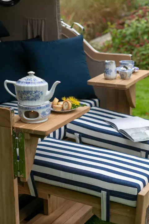 Nur die Nordsee ist schöner als dieser traumhafte Strandkorb, mit dem Sie sich maritimes Flair in den Garten holen. Der Strandkorb Rantum Grande macht seinem Namen alle Ehre: Edles Teakholz, Hochglanz-Bullaugen und eine üppige Polsterung machen den Volllieger zu einer wahren Wohlfühloase. Bei so viel Komfort kommt garantiert Urlaubsstimmung auf. Der Strandkorb Rantum Grande besticht mit einer durchdachten Mischung aus maritimen Details, hohem Komfort und luxuriöser Verarbeitung. Als Volllieger bietet der Strandkorb Rantum Grande ein Höchstmaß an Komfort. Auch in puncto Qualität genügt dieses Modell wie alle Strandkörbe der Rantum-Serie höchsten Ansprüchen. Der Strandkorb ist aus edlem Teakholz gefertigt und dadurch besonders widerstandsfähig gegenüber äußeren Witterungseinflüssen. Aufgelockert wird die massive Teak-Optik durch luftiges PE-Geflecht. Auch hierbei handelt es sich um ein sehr langlebiges und wetterfestes Material, das zudem schmutzabweisend und UV-beständig ist. Einem langjährigen intensiven Gebrauch steht also nichts im Wege. Das beidseitig eingelassene Bullauge zählt zu den besonderen Extras dieses Strandkorbes. Lehnen Sie sich zurück und genießen Sie den ungestörten Rundumblick, der an die Weiten von Nord- und Ostsee erinnert. Das Bullauge besteht aus Sicherheitsglas und ist in hochglänzendes Aluminium eingefasst. Damit bildet es die perfekte Ergänzung zu den übrigen Hochglanz-Beschlägen aus Edelstahl. Für einen optimalen Komfort verfügt der Strandkorb über eine großzügige Polsterung, bestehend aus extra dicken Sitz- und Fußkissen, Wurfkissen sowie Nackenkissen. Zwei schwenkbare Bistrotische und ausziehbare Fußbänke runden die üppige Ausstattung dieses Premium-Strandkorbes ab. Alle Bezüge bestehen aus hochwertigem Markisenstoff, sind abnehmbar und waschbar.