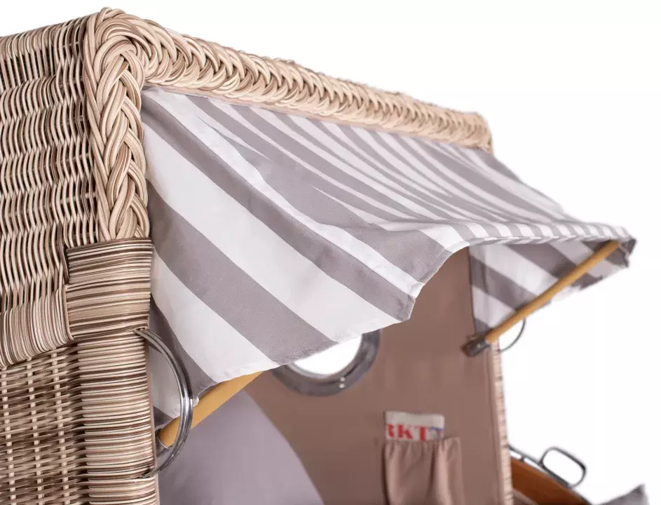 Die aufwendig gestaltete Flechtung des Strandkorbes wird in liebevoller Handarbeit für jeden Strandkorb einzeln erstellt. Die interessante Sonnenflechtung des Seitenteils und die formschöne Einbindung des Bullauges zeugen von hohem handwerklichem Geschick und verleihen dem Strandkorb Rantum ein außergewöhnliches und einzigartiges Design. Das verwendete PE (Polyethylen)-Geflecht ist ideal für den Einsatz im Freien, denn es ist robust und temperaturbeständig, besonders auch bei hohen Temperaturschwankungen. Zudem ist die glatte Oberfläche des Geflechtes schmutz- und witterungsabweisend. Weitere Vorteile wie UV-Beständigkeit und Farbechtheit machen Ihren Strandkorb Rantum zu einem langjährigen Begleiter, an dem Sie lange Ihre Freude haben werden!