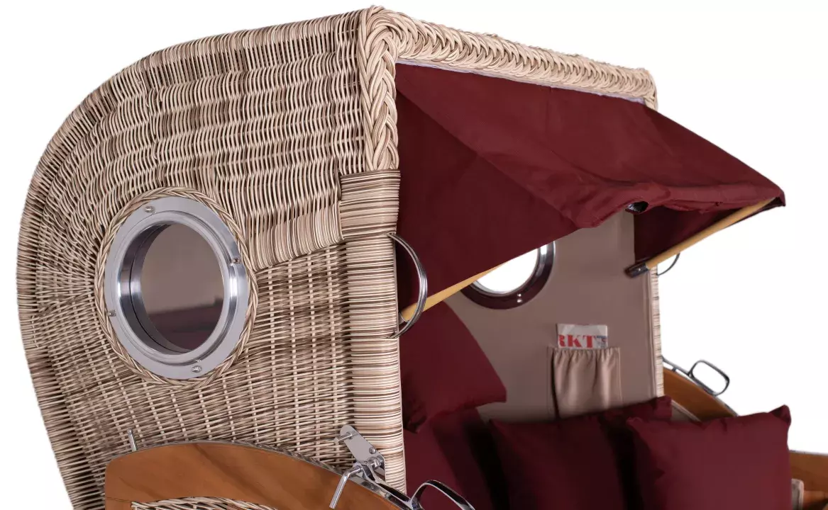 Die aufwendig gestaltete Flechtung des Strandkorbes wird in liebevoller Handarbeit für jeden Strandkorb einzeln erstellt. Die interessante Sonnenflechtung des Seitenteils und die formschöne Einbindung des Bullauges zeugen von hohem handwerklichem Geschick und verleihen dem Strandkorb Rantum ein außergewöhnliches und einzigartiges Design. Das verwendete PE (Polyethylen)-Geflecht ist ideal für den Einsatz im Freien, denn es ist robust und temperaturbeständig, besonders auch bei hohen Temperaturschwankungen. Zudem ist die glatte Oberfläche des Geflechtes schmutz- und witterungsabweisend. Weitere Vorteile wie UV-Beständigkeit und Farbechtheit machen Ihren Strandkorb Rantum zu einem langjährigen Begleiter, an dem Sie lange Ihre Freude haben werden!