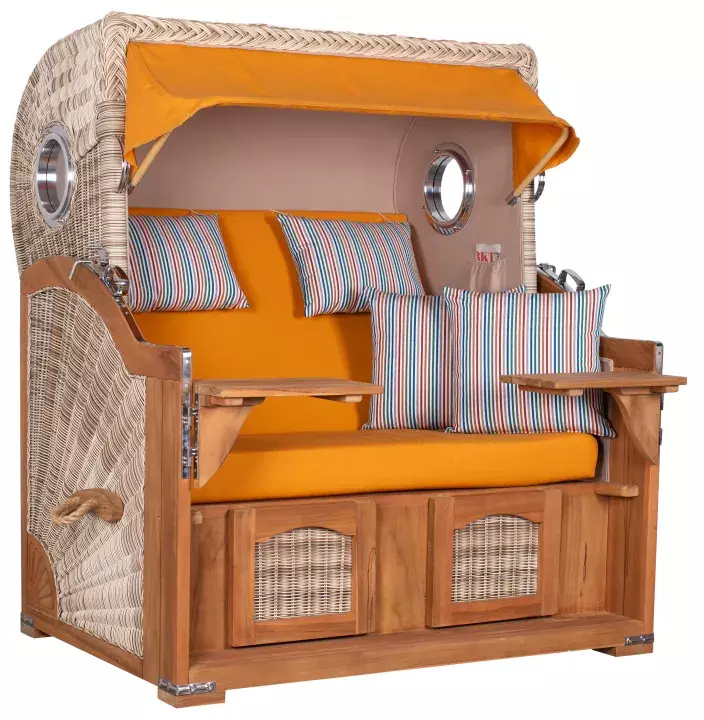 Nur die Nordsee ist schöner als dieser traumhafte Strandkorb, mit dem Sie sich maritimes Flair in den Garten holen. Der Strandkorb Rantum Grande macht seinem Namen alle Ehre: Edles Teakholz, Hochglanz-Bullaugen und eine üppige Polsterung machen den Volllieger zu einer wahren Wohlfühloase. Bei so viel Komfort kommt garantiert Urlaubsstimmung auf. Der Strandkorb Rantum Grande besticht mit einer durchdachten Mischung aus maritimen Details, hohem Komfort und luxuriöser Verarbeitung. Als Volllieger bietet der Strandkorb Rantum Grande ein Höchstmaß an Komfort. Auch in puncto Qualität genügt dieses Modell wie alle Strandkörbe der Rantum-Serie höchsten Ansprüchen. Der Strandkorb ist aus edlem Teakholz gefertigt und dadurch besonders widerstandsfähig gegenüber äußeren Witterungseinflüssen. Aufgelockert wird die massive Teak-Optik durch luftiges PE-Geflecht. Auch hierbei handelt es sich um ein sehr langlebiges und wetterfestes Material, das zudem schmutzabweisend und UV-beständig ist. Einem langjährigen intensiven Gebrauch steht also nichts im Wege. Das beidseitig eingelassene Bullauge zählt zu den besonderen Extras dieses Strandkorbes. Lehnen Sie sich zurück und genießen Sie den ungestörten Rundumblick, der an die Weiten von Nord- und Ostsee erinnert. Das Bullauge besteht aus Sicherheitsglas und ist in hochglänzendes Aluminium eingefasst. Damit bildet es die perfekte Ergänzung zu den übrigen Hochglanz-Beschlägen aus Edelstahl. Für einen optimalen Komfort verfügt der Strandkorb über eine großzügige Polsterung, bestehend aus extra dicken Sitz- und Fußkissen, Wurfkissen sowie Nackenkissen. Zwei schwenkbare Bistrotische und ausziehbare Fußbänke runden die üppige Ausstattung dieses Premium-Strandkorbes ab. Alle Bezüge bestehen aus hochwertigem Markisenstoff, sind abnehmbar und waschbar.