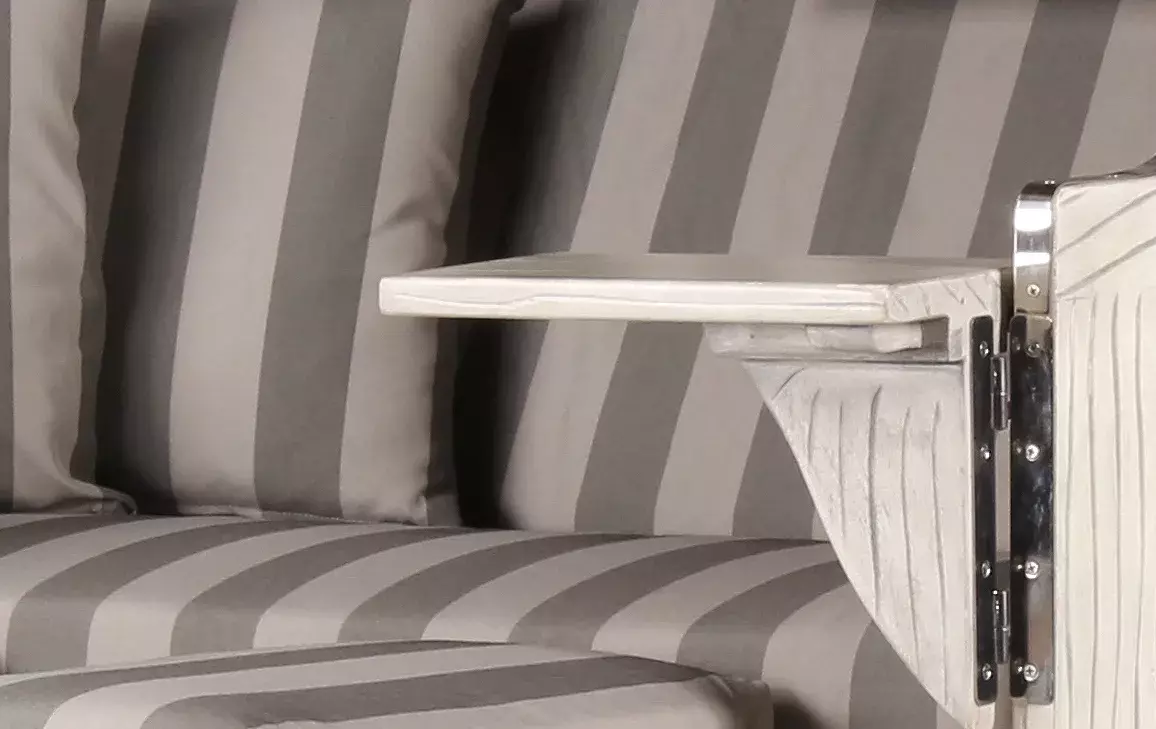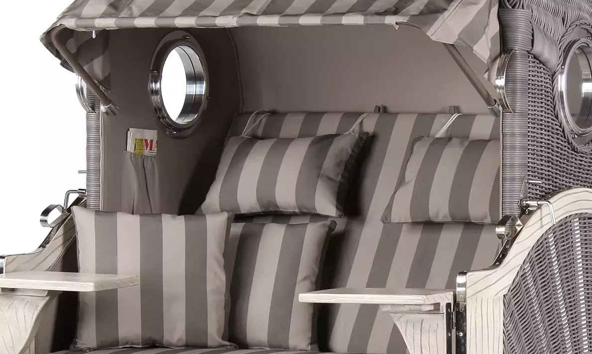 Der Strandkorb Rantum überzeugt durch die besonders hochwertig verarbeiteten edlen Materialien. Das massive Mahagoni mit seinem grau-weißen Farbton verleiht dem Strandkorb Westerland seinen ganz besonderen Charakter und macht ihn zu einem qualitativ hochwertigen Gartenmöbel. Die Verwendung von Mahagoniholz im Außenbereich hat eine lange Tradition. Das besonders harte und damit witterungsbeständige Holz wird von jeher sowohl im Schiffsbau als auch im Gartenbereich eingesetzt. Somit eignet es sich auch für die Herstellung von Strandkörben besonders gut. Zudem wird der maritime Charakter unseres Strandkorbes Rantum mit den eingebauten Bullaugen durch den Einsatz von Mahagoni unterstrichen. Das besondere Design macht den Strandkorb Rantum zu einem absoluten Highlight in Ihrem Garten oder auf Ihrer Terrasse!