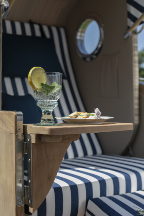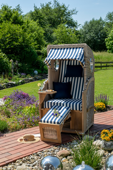 Luxuriöse Entspannung inklusive: Strandkorb Rantum Single Bullauge Teak PE grey Dessin 518 - KOMPLETTSET
