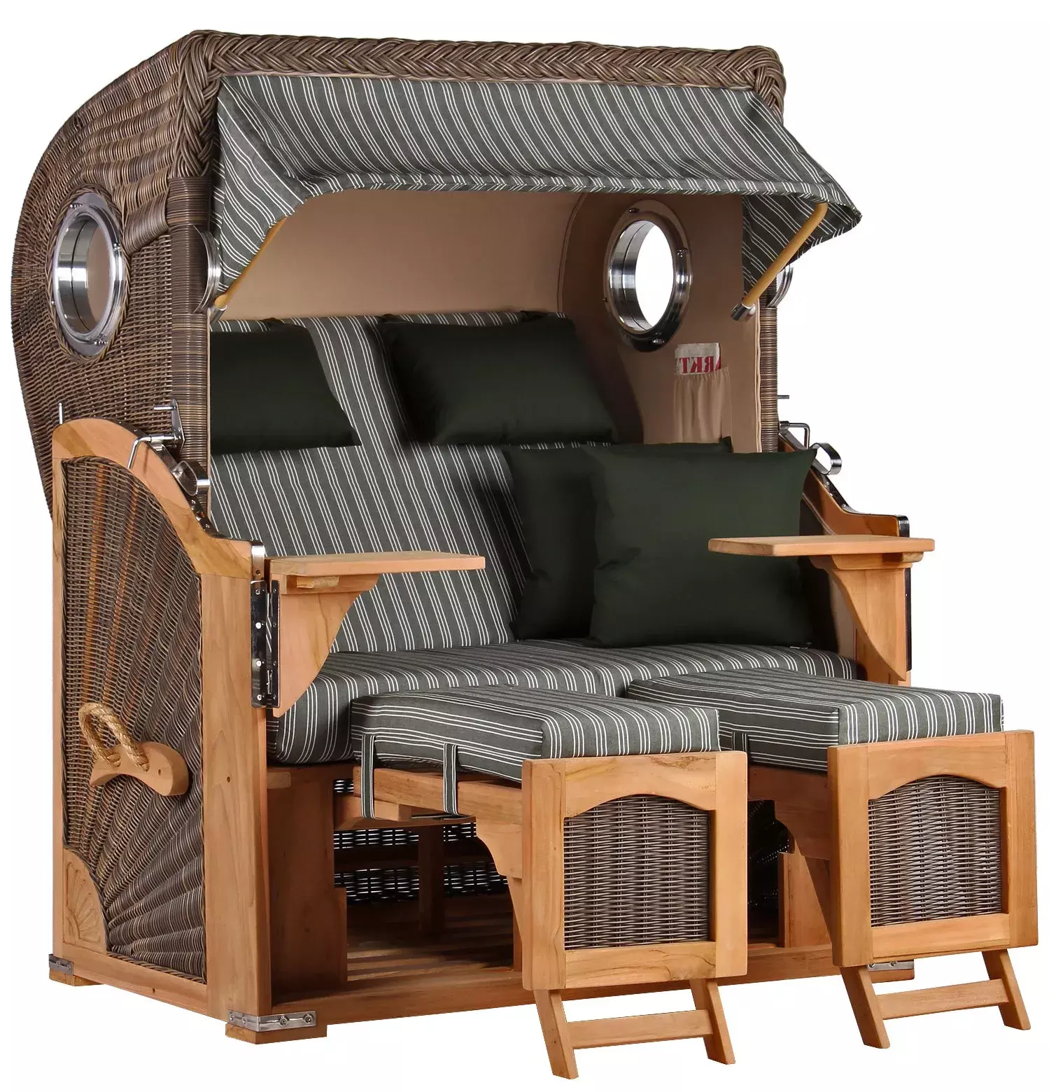 Neben dem massiven Teakholz und beständigen PE-Geflecht verwenden wir für unseren Strandkorb Rantum ausschließlich hochwertige Edelstahlbeschläge aus V2A-Edelstahl. Diese Beschläge kommen bei der Befestigung der Bistrotische, der Verstärkung der unteren Ecken und beim Feststellmechanismus der Verstellgriffe zum Einsatz. Komplettiert wird der Strandkorb Rantum durch eine Vielzahl durchdachter Extras. So verfügt der Strandkorb Rantum nicht nur über eine extra-dicke Polsterung, sondern auch über farblich passende Wurfkissen und verstellbare Nackenkissen. Zeitungstaschen, integrierte Armlehnen, zwei große, schwenkbare und zudem abnehmbare Bistrotische und ein praktisches Staufach unterhalb der Sitzfläche lassen keine Wünsche offen und machen den Strandkorb Rantum bald auch zu Ihrem Lieblingsplatz im Garten oder auf der Terrasse.