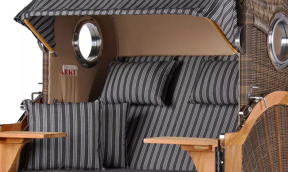 Die aufwendig gestaltete Flechtung des Strandkorbes wird in liebevoller Handarbeit für jeden Strandkorb einzeln erstellt. Die interessante Sonnenflechtung des Seitenteils und die formschöne Einbindung des Bullauges zeugen von hohem handwerklichem Geschick und verleihen dem Strandkorb Rantum ein außergewöhnliches und einzigartiges Design. Das verwendete PE (Polyethylen)-Geflecht ist ideal für den Einsatz im Freien, denn es ist robust und temperaturbeständig, besonders auch bei hohen Temperaturschwankungen. Zudem ist die glatte Oberfläche des Geflechtes schmutz- und witterungsabweisend. Weitere Vorteile wie UV-Beständigkeit und Farbechtheit machen Ihren Strandkorb Rantum zu einem langjährigen Begleiter, an dem Sie lange Ihre Freude haben werden!