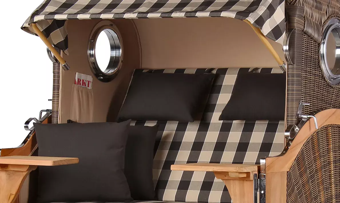 Die aufwendig gestaltete Flechtung des Strandkorbes wird in liebevoller Handarbeit für jeden Strandkorb einzeln erstellt. Die interessante Sonnenflechtung des Seitenteils und die formschöne Einbindung des Bullauges zeugen von hohem handwerklichem Geschick und verleihen dem Strandkorb Rantum ein außergewöhnliches und einzigartiges Design. Das verwendete PE (Polyethylen)-Geflecht ist ideal für den Einsatz im Freien, denn es ist robust und temperaturbeständig, besonders auch bei hohen Temperaturschwankungen. Zudem ist die glatte Oberfläche des Geflechtes schmutz- und witterungsabweisend. Weitere Vorteile wie UV-Beständigkeit und Farbechtheit machen Ihren Strandkorb Rantum zu einem langjährigen Begleiter, an dem Sie lange Ihre Freude haben werden!