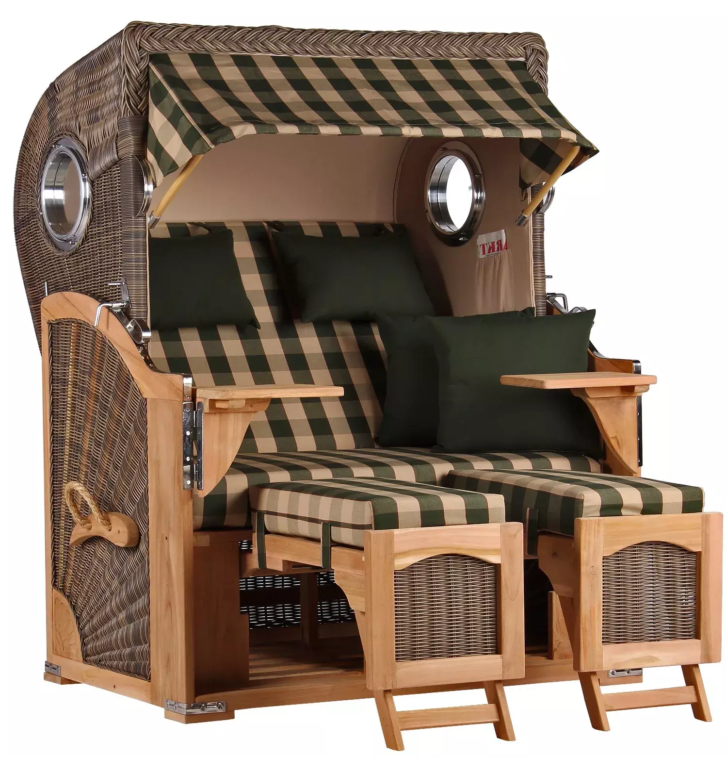 Der Strandkorb Rantum aus elegantem Teakholz lässt Sie mit seiner komfortablen Ausstattung den Alltag vergessen. Dicke hochwertige Polster, weiche Nackenkissen und verstellbare Fußstützen sorgen für angenehmes Sitzen. Für Freunde der besonderen Bequemlichkeit lässt er sich ganz einfach zum Volllieger umfunktionieren. Der Oberkorb ist in mehreren Stufen verstellbar, sodass Sie sich ihren Sonnensitz leicht nach Ihren Bedürfnissen gestalten können. Mit seinem Bullauge, seiner Sonnenmarkise und seinem hellen PE-Rattangeflecht verbreitet er das Urlaubsambiente, das Sie zur Entspannung brauchen. Teakholz beeindruckt zum einen durch seine elegante Ausstrahlung, zum andern durch seine praktischen stark wasserabweisenden Eigenschaften. In Verbindung mit dem hochwertigen witterungsbeständigen PE-Geflecht bildet dieser Strandkorb ein Meisterwerk, das Sie sowohl im Terrassen- und Gartenbereich, als auch innerhalb Ihres Hauses platzieren können.