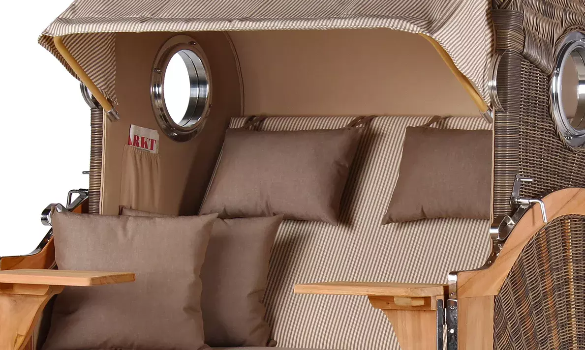 Die aufwendig gestaltete Flechtung des Strandkorbes wird in liebevoller Handarbeit für jeden Strandkorb einzeln erstellt. Die interessante Sonnenflechtung des Seitenteils und die formschöne Einbindung des Bullauges zeugen von hohem handwerklichem Geschick und verleihen dem Strandkorb Rantum ein außergewöhnliches und einzigartiges Design. Das verwendete PE (Polyethylen)-Geflecht ist ideal für den Einsatz im Freien, denn es ist robust und temperaturbeständig, besonders auch bei hohen Temperaturschwankungen. Zudem ist die glatte Oberfläche des Geflechtes schmutz- und witterungsabweisend. Weitere Vorteile wie UV-Beständigkeit und Farbechtheit machen Ihren Strandkorb Rantum zu einem langjährigen Begleiter, an dem Sie lange Ihre Freude haben werden!