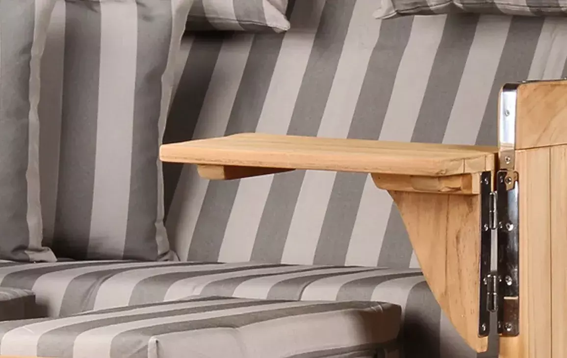 Neben dem massiven Teakholz und beständigen PE-Geflecht verwenden wir für unseren Strandkorb Rantum ausschließlich hochwertige Edelstahlbeschläge aus V2A-Edelstahl. Diese Beschläge kommen bei der Befestigung der Bistrotische, der Verstärkung der unteren Ecken und beim Feststellmechanismus der Verstellgriffe zum Einsatz. Komplettiert wird der Strandkorb Rantum durch eine Vielzahl durchdachter Extras. So verfügt der Strandkorb Rantum nicht nur über eine extra-dicke Polsterung, sondern auch über farblich passende Wurfkissen und verstellbare Nackenkissen. Zeitungstaschen, integrierte Armlehnen, zwei große, schwenkbare und zudem abnehmbare Bistrotische und ein praktisches Staufach unterhalb der Sitzfläche lassen keine Wünsche offen und machen den Strandkorb Rantum bald auch zu Ihrem Lieblingsplatz im Garten oder auf der Terrasse.