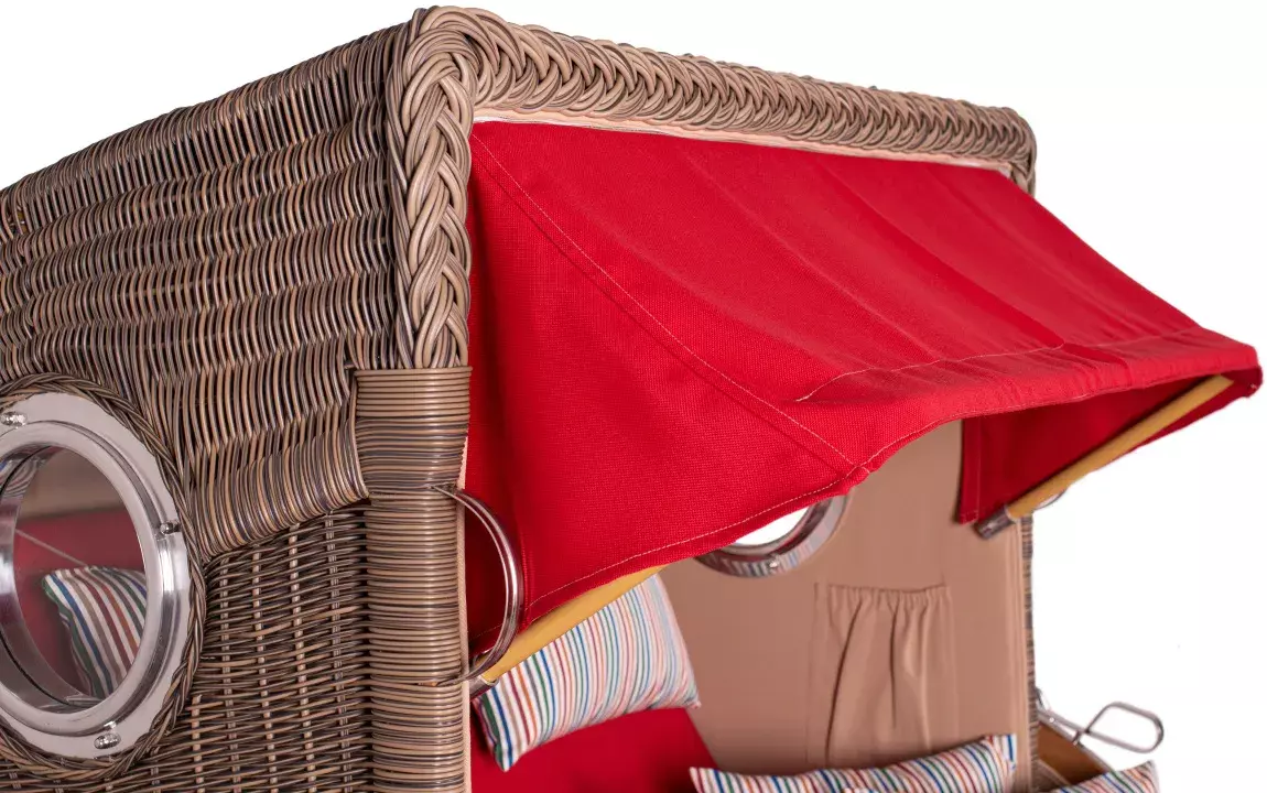 Die aufwendig gestaltete Flechtung des Strandkorbes wird in liebevoller Handarbeit für jeden Strandkorb einzeln erstellt. Die interessante Sonnenflechtung des Seitenteils und die formschöne Einbindung des Bullauges zeugen von hohem handwerklichem Geschick und verleihen dem Strandkorb Rantum ein außergewöhnliches und einzigartiges Design. Das verwendete PE (Polyethylen)-Geflecht ist ideal für den Einsatz im Freien, denn es ist robust und temperaturbeständig, besonders auch bei hohen Temperaturschwankungen. Zudem ist die glatte Oberfläche des Geflechtes schmutz- und witterungsabweisend. Weitere Vorteile wie UV-Beständigkeit und Farbechtheit machen Ihren Strandkorb Rantum zu einem langjährigen Begleiter, an dem Sie lange Ihre Freude haben werden!