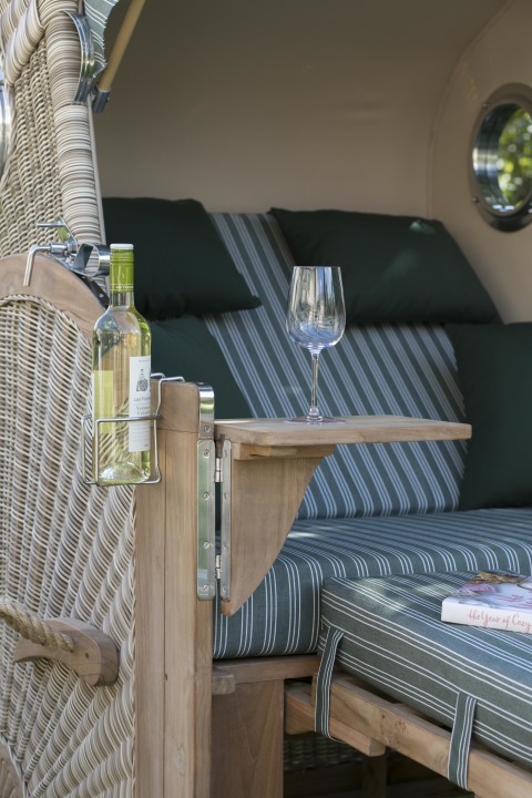 Neben dem massiven Teakholz und beständigen PE-Geflecht verwenden wir für unseren Strandkorb Rantum ausschließlich hochwertige Edelstahlbeschläge aus V2A-Edelstahl. Diese Beschläge kommen bei der Befestigung der Bistrotische, der Verstärkung der unteren Ecken und beim Feststellmechanismus der Verstellgriffe zum Einsatz. Komplettiert wird der Strandkorb Rantum durch eine Vielzahl durchdachter Extras. So verfügt der Strandkorb Rantum nicht nur über eine extra-dicke Polsterung, sondern auch über farblich passende Wurfkissen und verstellbare Nackenkissen. Zeitungstaschen, integrierte Armlehnen, zwei große, schwenkbare und zudem abnehmbare Bistrotische und ein praktisches Staufach unterhalb der Sitzfläche lassen keine Wünsche offen und machen den Strandkorb Rantum bald auch zu Ihrem Lieblingsplatz im Garten oder auf der Terrasse.