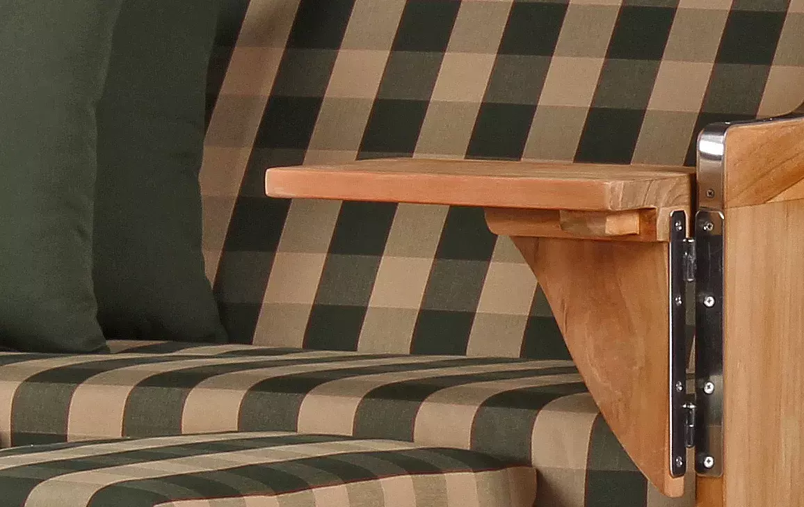 Neben dem massiven Teakholz und beständigen PE-Geflecht verwenden wir für unseren Strandkorb Rantum ausschließlich hochwertige Edelstahlbeschläge aus V2A-Edelstahl. Diese Beschläge kommen bei der Befestigung der Bistrotische, der Verstärkung der unteren Ecken und beim Feststellmechanismus der Verstellgriffe zum Einsatz. Komplettiert wird der Strandkorb Rantum durch eine Vielzahl durchdachter Extras. So verfügt der Strandkorb Rantum nicht nur über eine extra-dicke Polsterung, sondern auch über farblich passende Wurfkissen und verstellbare Nackenkissen. Zeitungstaschen, integrierte Armlehnen, zwei große, schwenkbare und zudem abnehmbare Bistrotische und ein praktisches Staufach unterhalb der Sitzfläche lassen keine Wünsche offen und machen den Strandkorb Rantum bald auch zu Ihrem Lieblingsplatz im Garten oder auf der Terrasse.